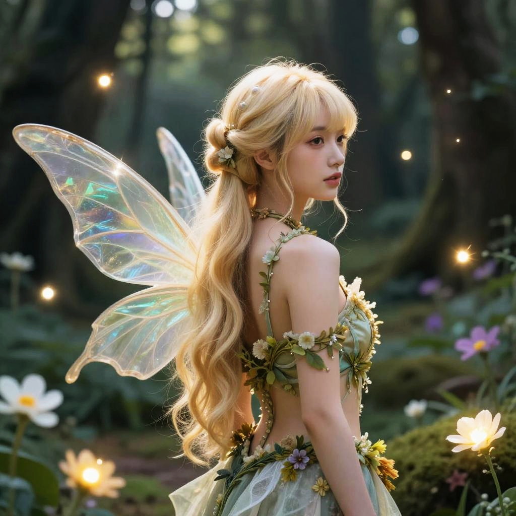Blonde ponytail with bangs, fantasy forest fairy with delicate wings, surrounded by glowing flowers and floating lights, mystical atmosphere, intricate costume with natural elements, detailed hair strands, vibrant colors, enchanted scene.