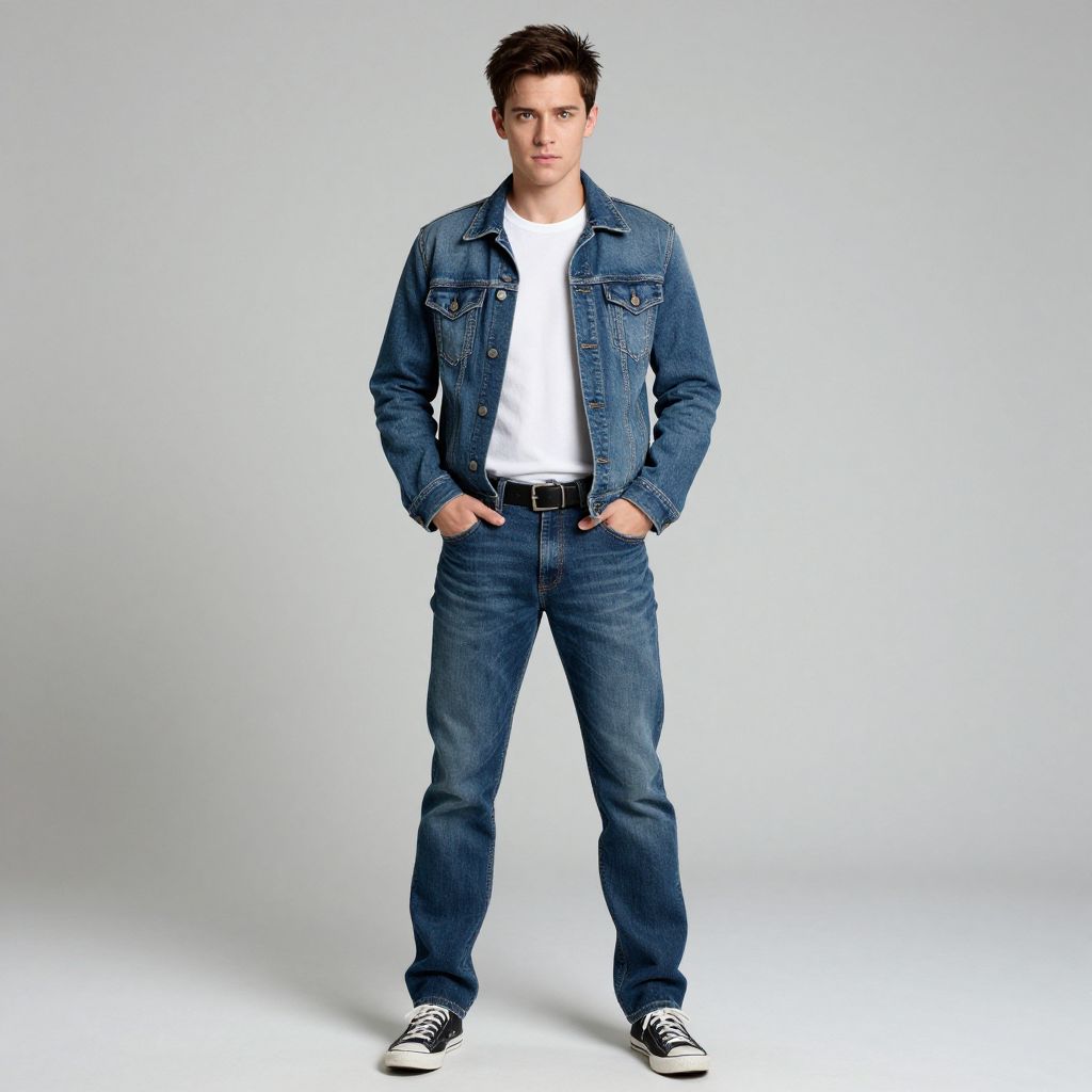 Photograph of a young man with short brown hair, wearing a blue denim jacket, white t-shirt, blue jeans, black belt, and black sneakers