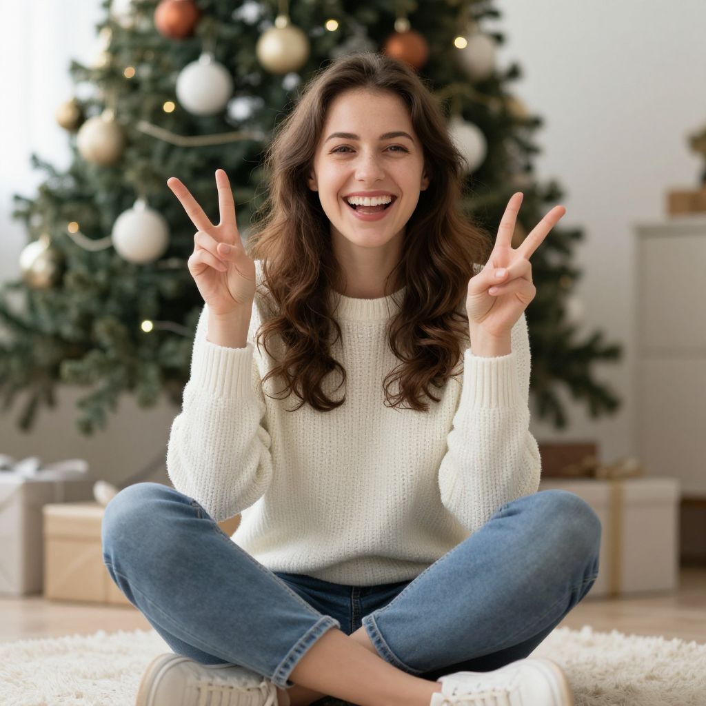 Happy woman showing victory sign. Happy Christmas woman sitting down with legs crossed and showing victory sign stock photos