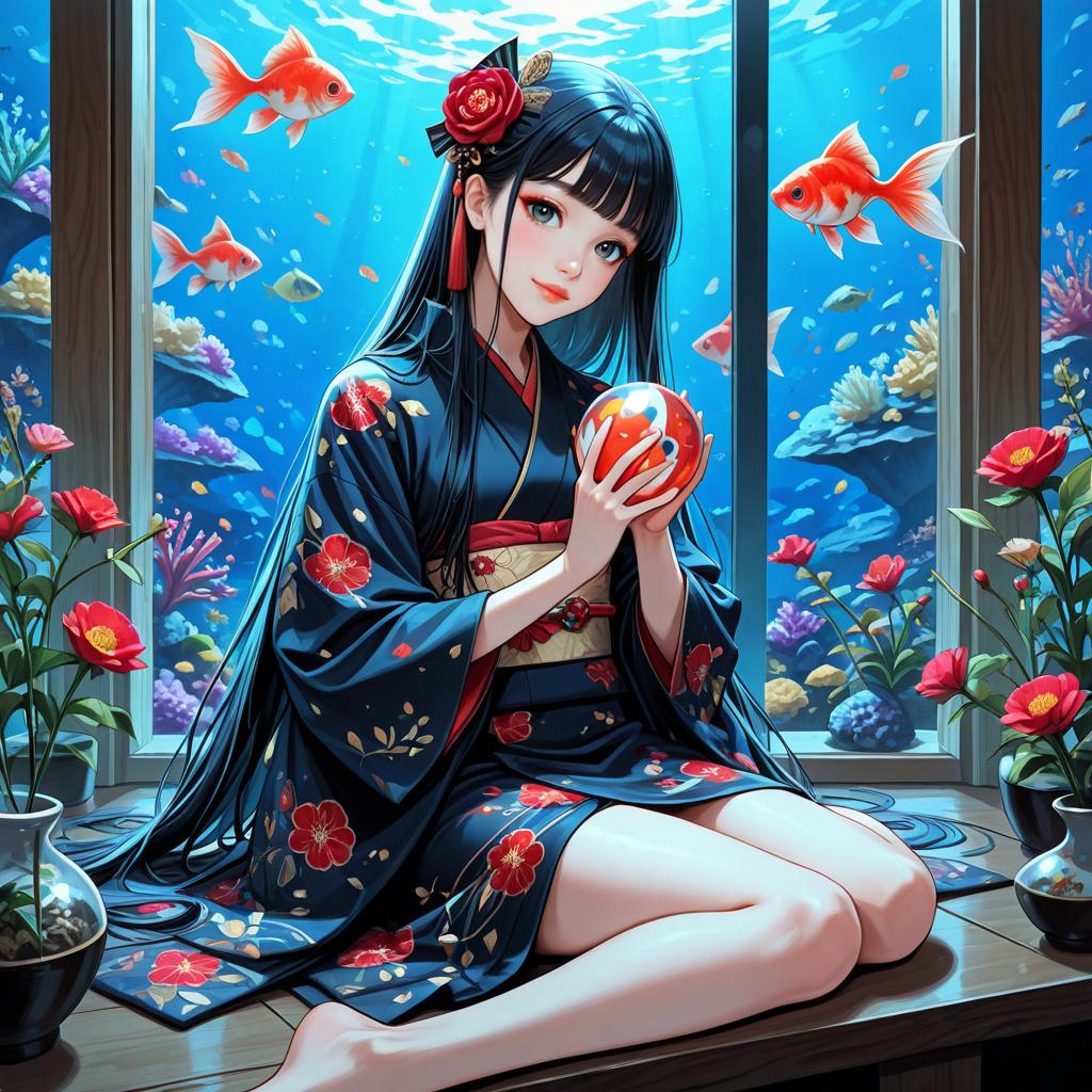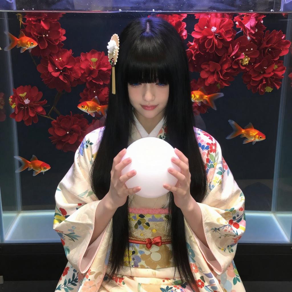 Detailed_background, indoors, flower, blunt_bangs, hair_ornament, feet_out_of_frame, tanishi_(tanishi_0403), hair_flower, closed_mouth, goldfish, long_sleeves, very_long_hair, solo, fish, hair_spread_out, floral_print, japanese_clothes, red_flower, fan_hair_ornament, holding, eyebrows_hidden_by_hair, aquarium, long_hair, holding_ball, highres, black_hair, straight_hair, head_tilt, ball, 1girl, bare_legs, blue_eyes, smile, looking_at_viewer, kimono, wide_sleeves
