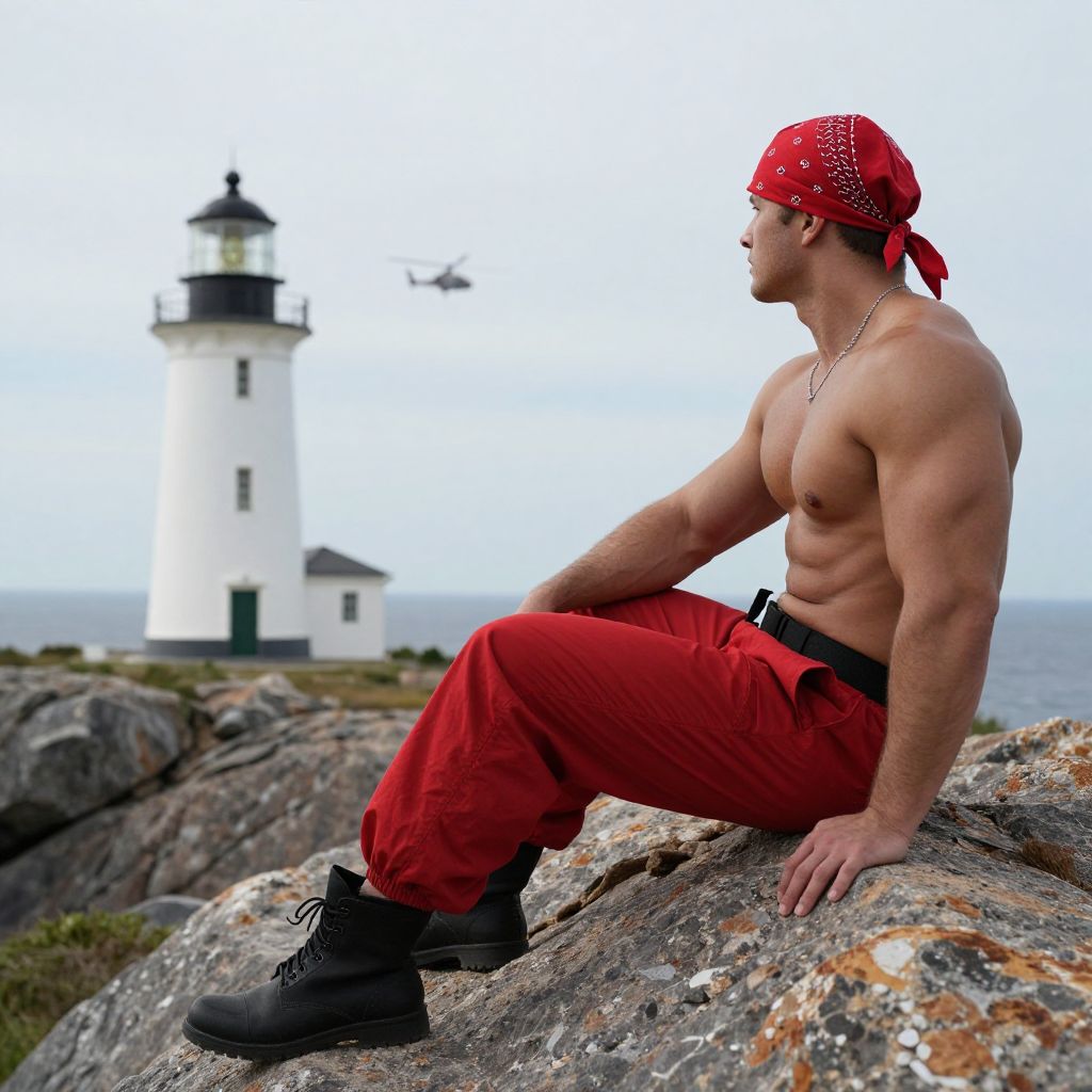 Photograph of a muscular, shirtless man with light skin, wearing a red bandana, red pants, black boots, and a necklace, sitting on rocky terrain. He has a defined six-pack and is looking at a white lighthouse in the background. A helicopter is visible in the sky above the lighthouse. The rocks are gray with orange and white speckles, and the ocean is visible in the distance. The man's red pants and bandana contrast with the muted colors of the rocks and lighthouse. The image has a slightly surreal, high-contrast style.