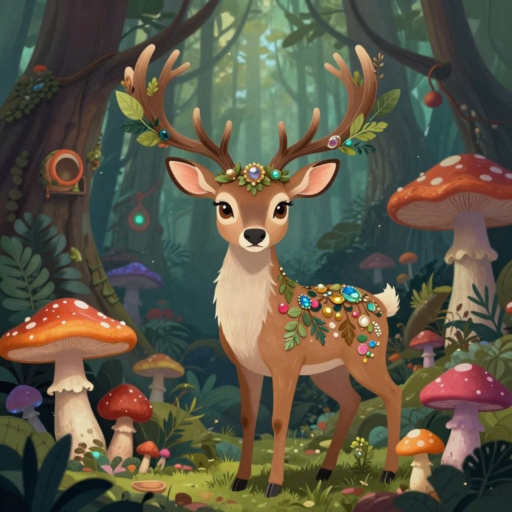 A detailed, high-quality digital illustration of an anthropomorphic deer girl with antlers and ears decorated with foliage and jewels. She stands surrounded by vibrant, colorful fungi in a whimsical woodland forest setting. The scene features rich jewel tones, intricate leaf and floral patterns on her clothing, and a magical vibrant atmosphere with natural lighting.