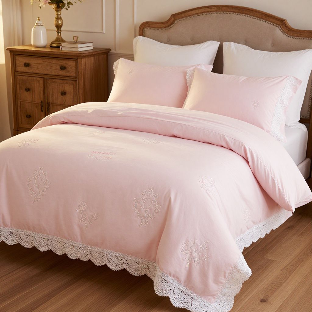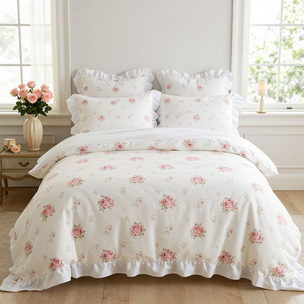 An ethereal haven of serenity and nostalgia, this rose-patterned bedding invites dreams of blooming gardens, whispers of vintage charm, and the gentle embrace of timeless elegance.