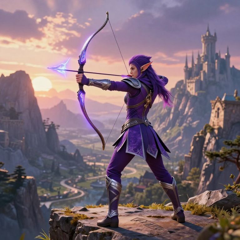 Epic fantasy artwork: Purple-haired elf archer with glowing bow, standing on rocky cliff, aiming at sunset-lit castle city landscape.