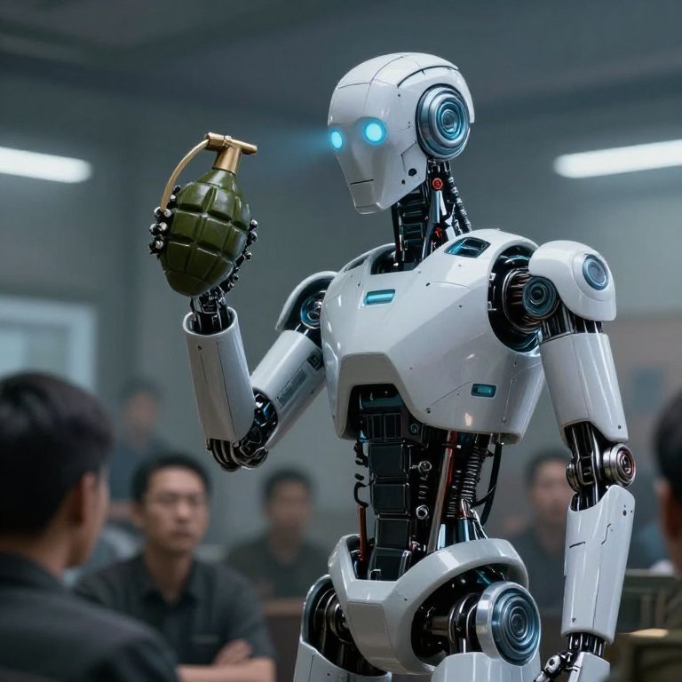 Photograph of a white, humanoid robot with glowing blue eyes holding a green and yellow grenade in its right hand. The robot has sleek, shiny, segmented limbs and a smooth, metallic body. Its head is round with a single blue eye on each side. In the blurred background, several people, mostly Asian males with short black hair, are seated and watching the robot. The setting appears to be an indoor room with gray walls and fluorescent lighting. The overall mood is futuristic and slightly tense.