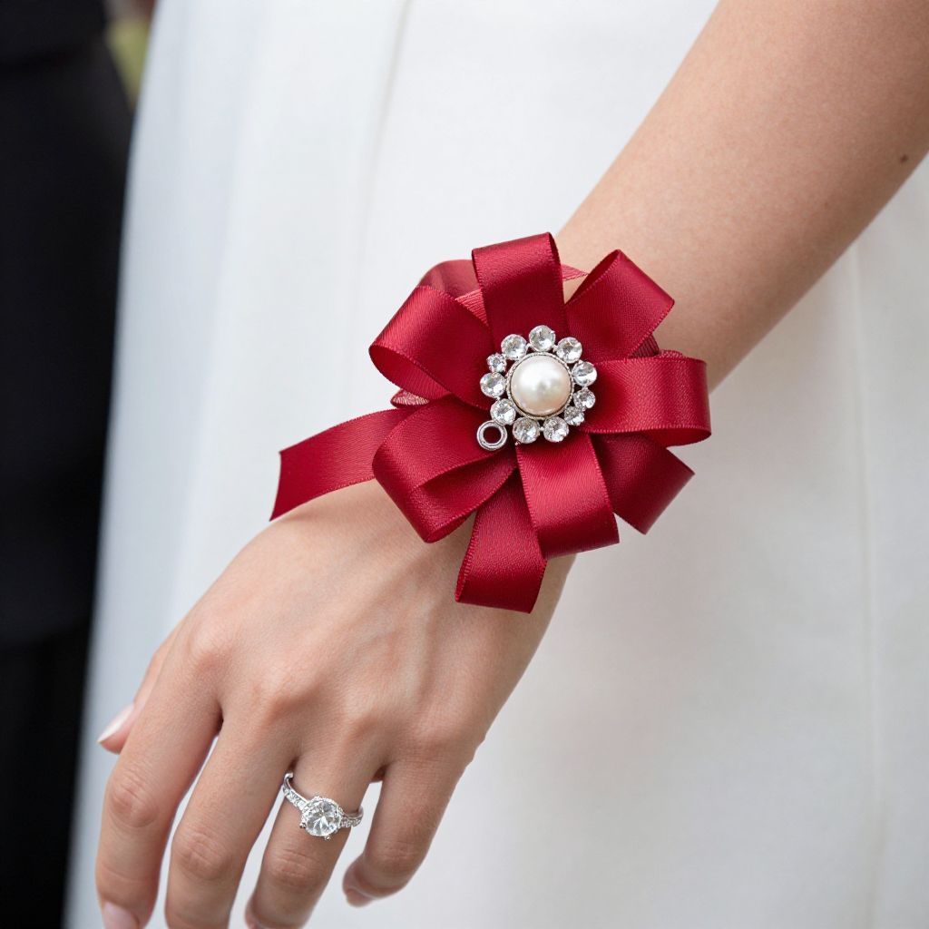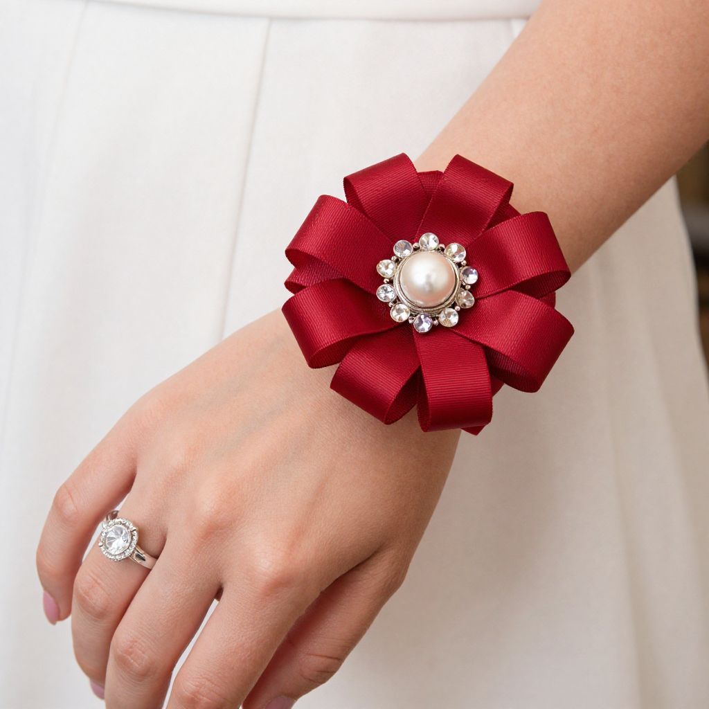 Elegant wrist corsage featuring a vibrant red ribbon flower adorned with a pearl and crystal embellishment, gracefully worn alongside a sparkling diamond ring on a woman's hand.