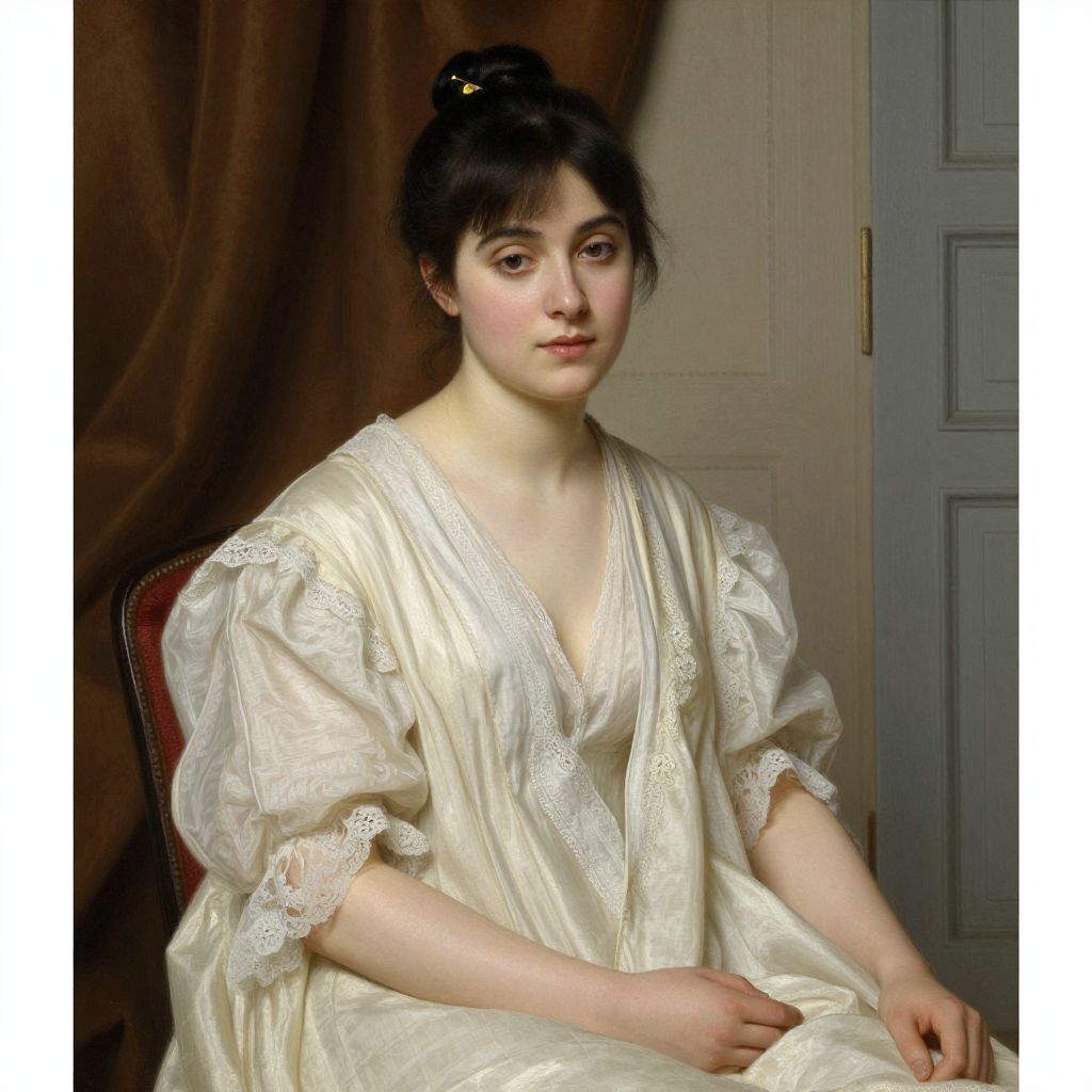 William-Adolphe Bouguereau's portrait depicts a serene young woman seated indoors, her dark hair neatly styled in a bun with a golden pin, wearing a cream-colored dress with delicate lace trim and puff sleeves, her hands gently resting on her lap against a muted background featuring a brown curtain and a partially visible door.