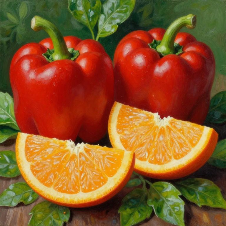 A hyper-realistic still life painting featuring vibrant red bell peppers, juicy orange slices, and lush green foliage, rendered with meticulous detail and dramatic lighting, showcasing the artist's skill in capturing texture and color in a high-definition, oil-painting style.