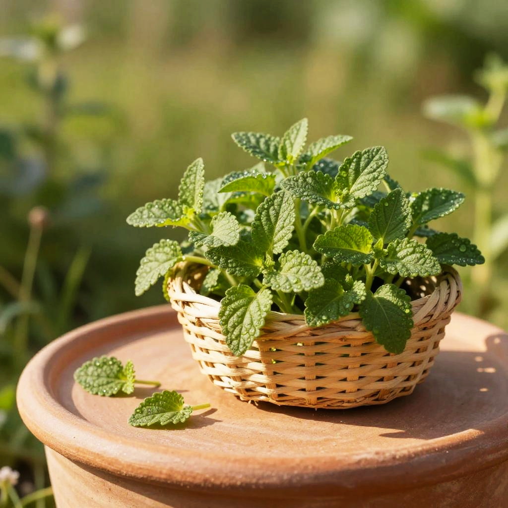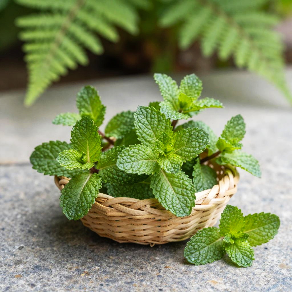 Photograph of a small, woven, light brown basket filled with fresh, vibrant green mint leaves. The basket is placed on a textured, gray stone surface. The mint leaves are detailed with serrated edges and a slightly rough texture. In the blurred background, there are additional green fern-like leaves, adding a natural, garden-like setting to the image. The lighting is bright and natural, highlighting the freshness and vivid color of the mint leaves. The overall composition is simple yet elegant, focusing on the natural beauty of the mint and basket.