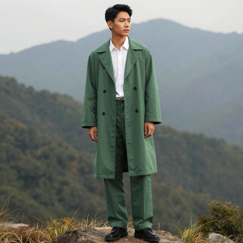 Green Coat Pant, man in a green suit standing on a mountain