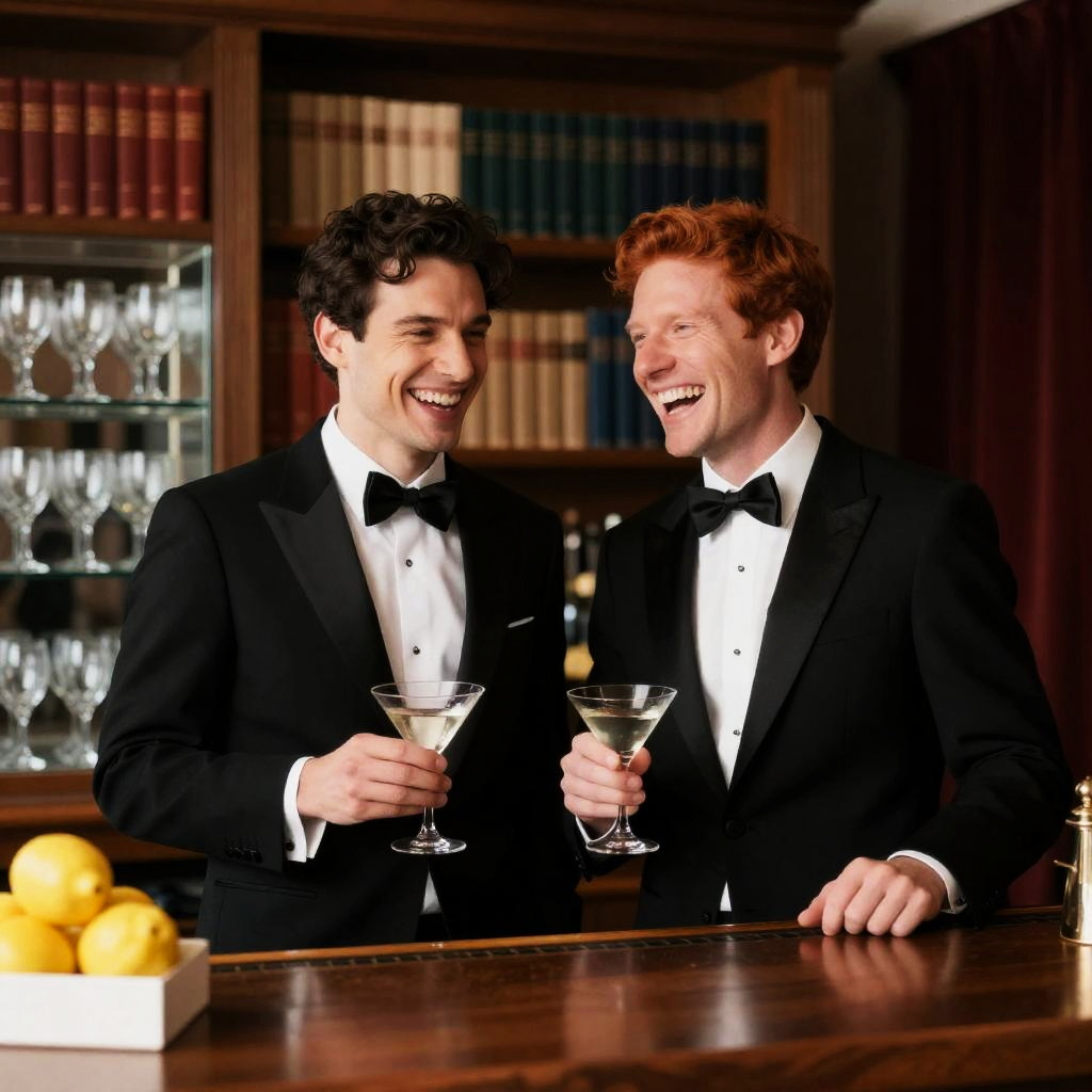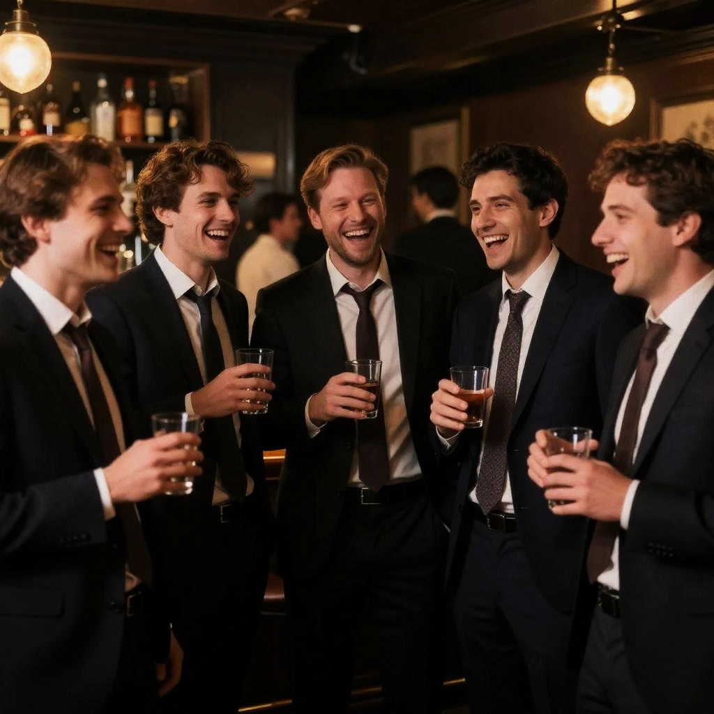 Six young men dressed in dark suits and ties standing closely together in a dimly lit bar. They are laughing and holding glasses with drinks, creating a warm and intimate atmosphere. The background features blurred figures and shelves stocked with bottles, enhancing the bar setting.