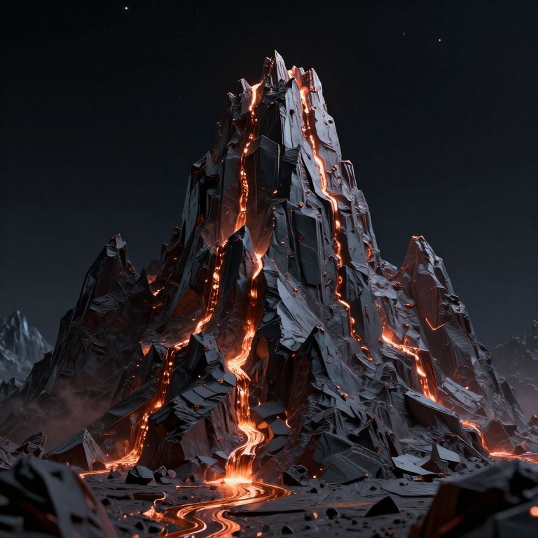 CGI image of a towering, jagged mountain peak with glowing, molten lava flows cascading down its dark, rocky surface under a starry