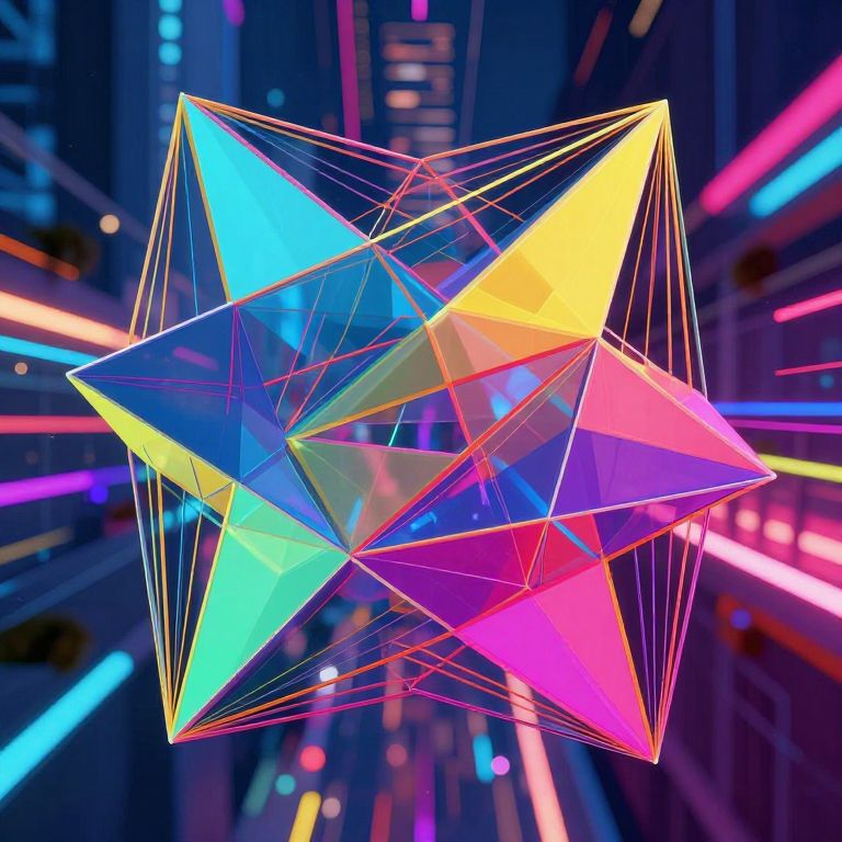 A vibrant, digital CGI image depicting a large, glowing, multicolored geometric star composed of overlapping, neon-colored triangles in blue, yellow, pink, and green. The star is outlined by thin, neon lines, floating in a dynamic, futuristic cityscape with neon lights in various colors (pink, blue, yellow) illuminating the background. The background is blurred, highlighting the star's luminous, colorful design. The overall style is modern and cyberpunk, with a strong emphasis on bright, neon aesthetics and geometric shapes.