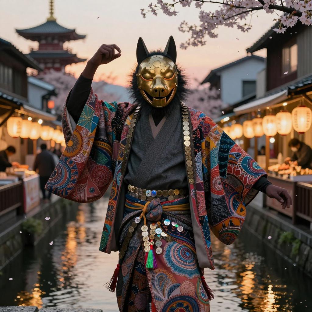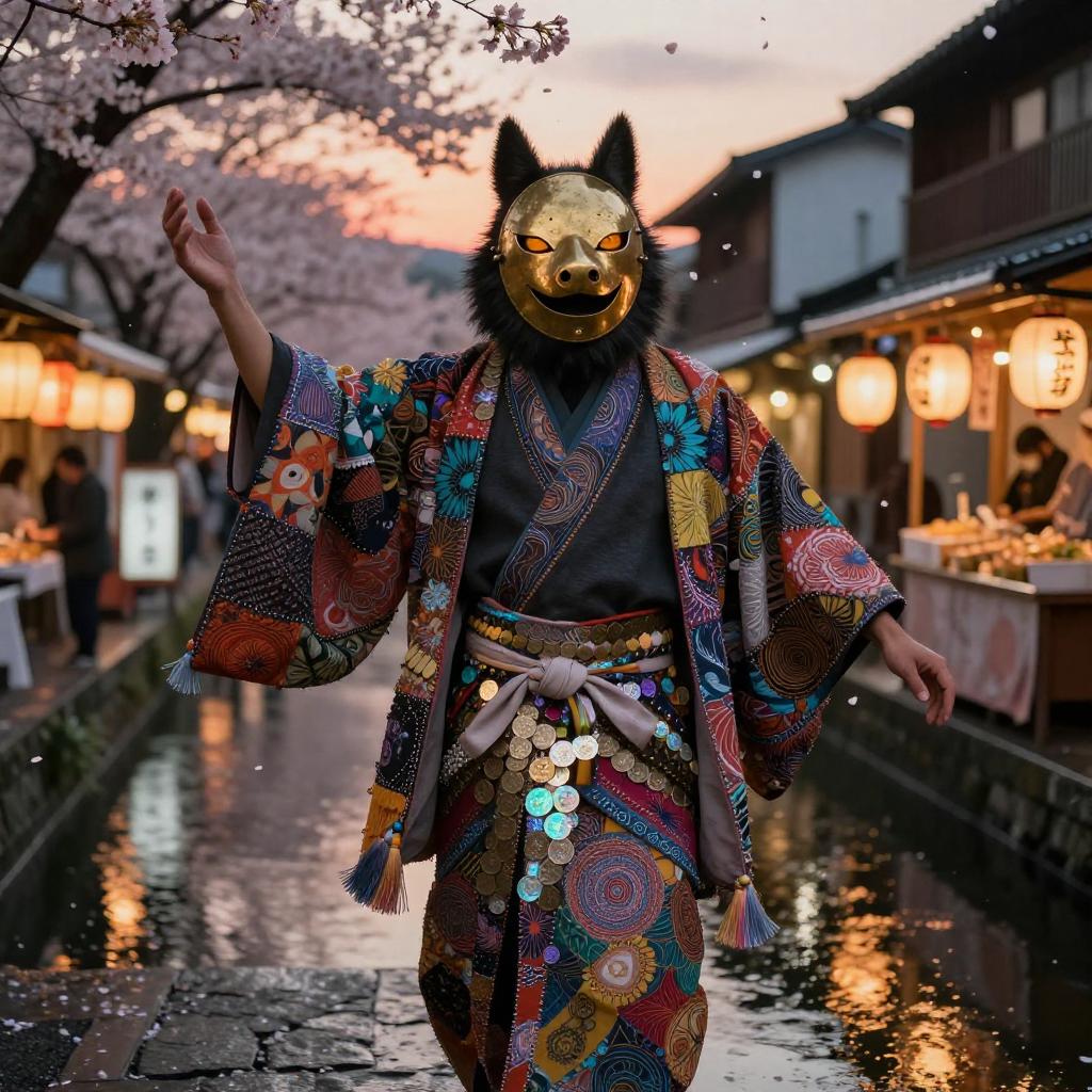 Best quality, masterpiece, ultra high res, raw photo, beautiful and aesthetic, deep shadow, dark theme, (photorealistic:1.4), masked tanuki trickster spirit with a polished brass snout-mask and mischievous amber eyes, wearing patchwork haori and hakama woven with alloy coin-inlays, holographic tassels and stitched zentangle panels, soft smile, open mouth, closed eyes, ((chiaroscuro, backlight, sunset, petals floating)), graceful poise, evocative atmosphere, magnetic presence, captivating mystique, intricate zentangle patterns, astonishing level of detail, striking perspective, a chaotic masterpiece balanced by harmony, vibrant color palette, ((outdoors)), nocturnal lantern market along a rain-slick canal lined with neon stalls, glass pagodas and floating food-stands, drifting sakura and bioluminescent petals beneath a distant futurist skyline, inspired by futurist architecture