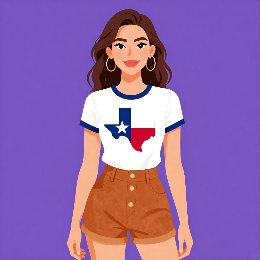 Digital illustration of a smiling woman with wavy brown hair, wearing a white T-shirt with a Texas flag design, high-waisted brown shorts,