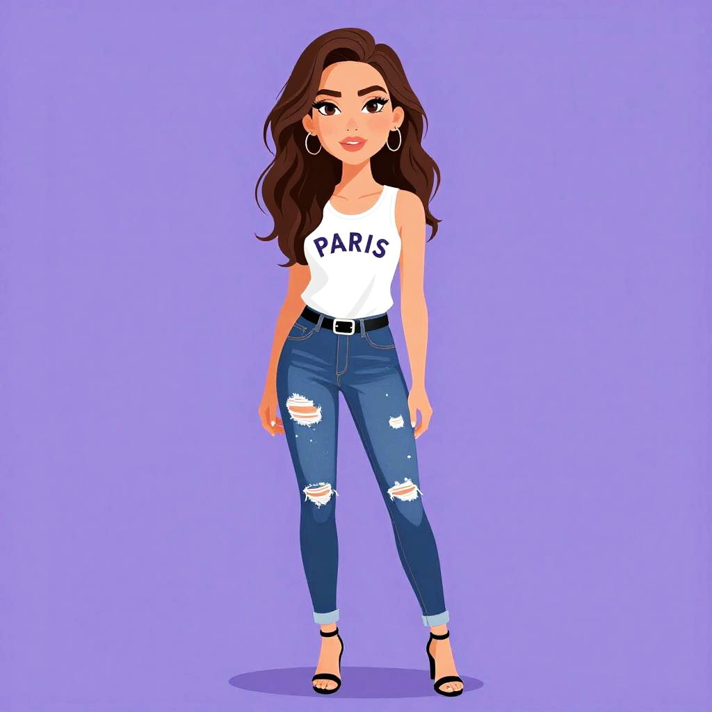 Digital illustration of a young woman with long, wavy brown hair and fair skin, standing against a solid purple background. She wears a white T-shirt with a blue and red state of Texas graphic, blue-trimmed sleeves, and high-waisted, brown button-up shorts. She accessorizes with large hoop earrings and has a slight smile. The art style is vibrant and cartoon-like, with bold colors and clean lines. The woman's figure is average, with a slim build and medium-sized breasts. The overall appearance is casual and modern.