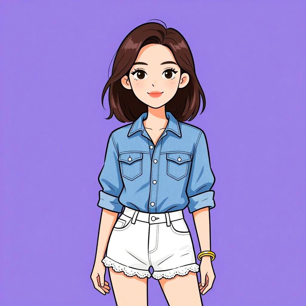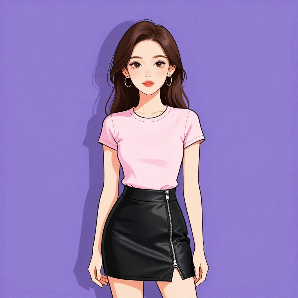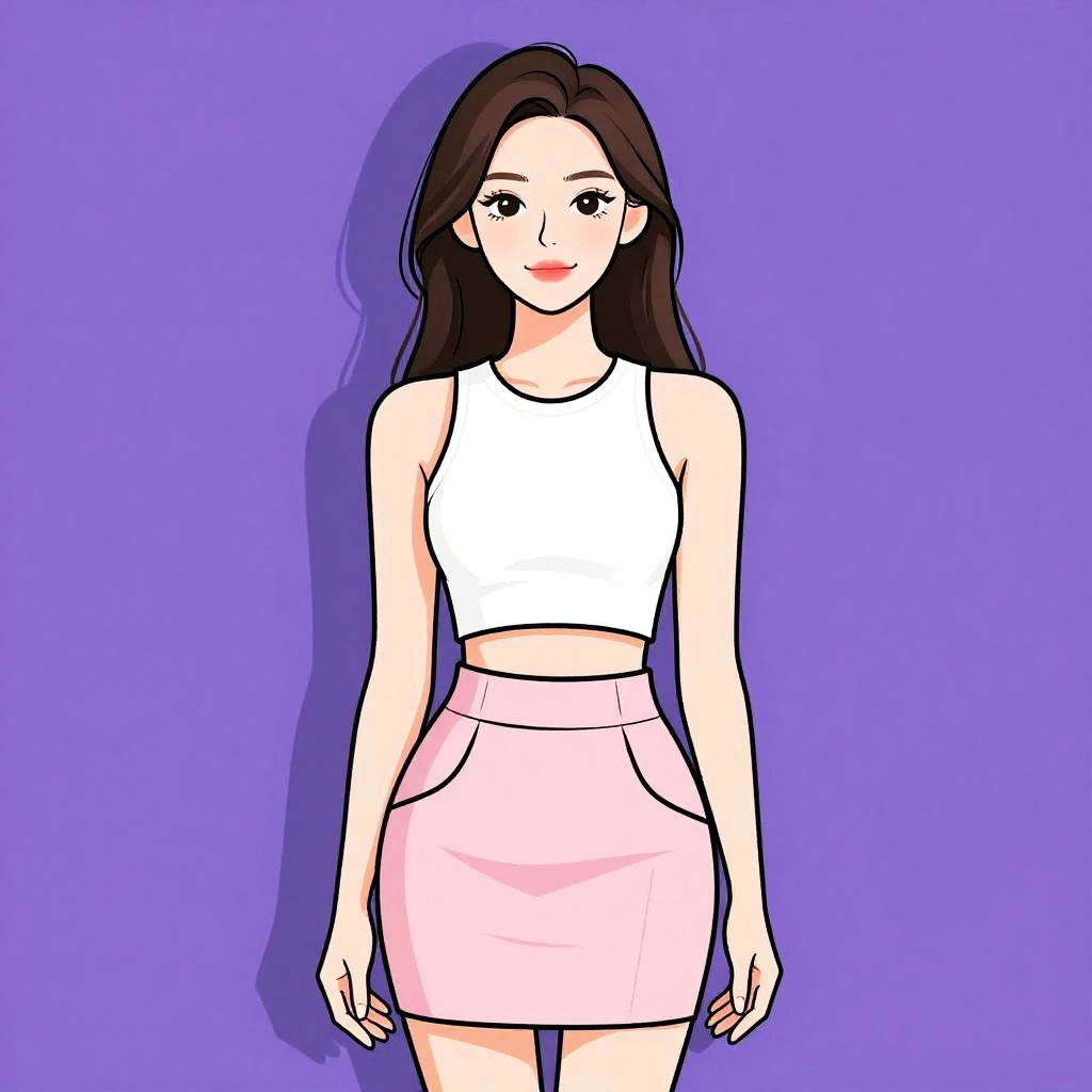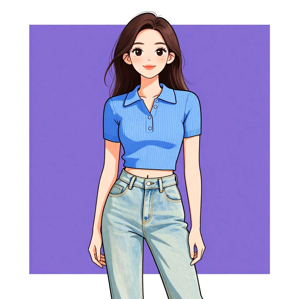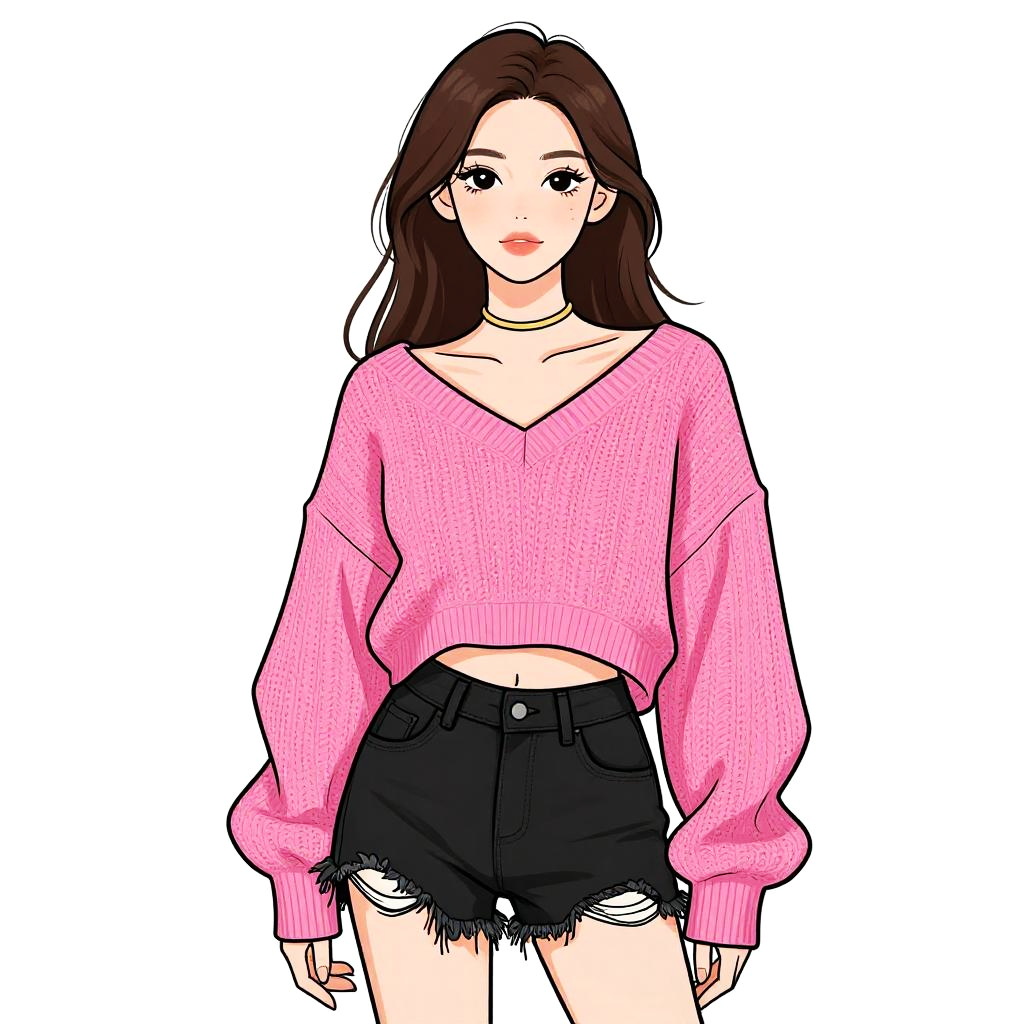 Woman with pretty face and pretty hair. Woman, casual streetwear, cropped fitted t-shirt in neon pink, short sleeves, crew neck, high-waisted jeans in pastel pink, acid wash, straight-leg cut, silver button closure, contrasting tan stitching, basic wristbands, white background. --sref 1467