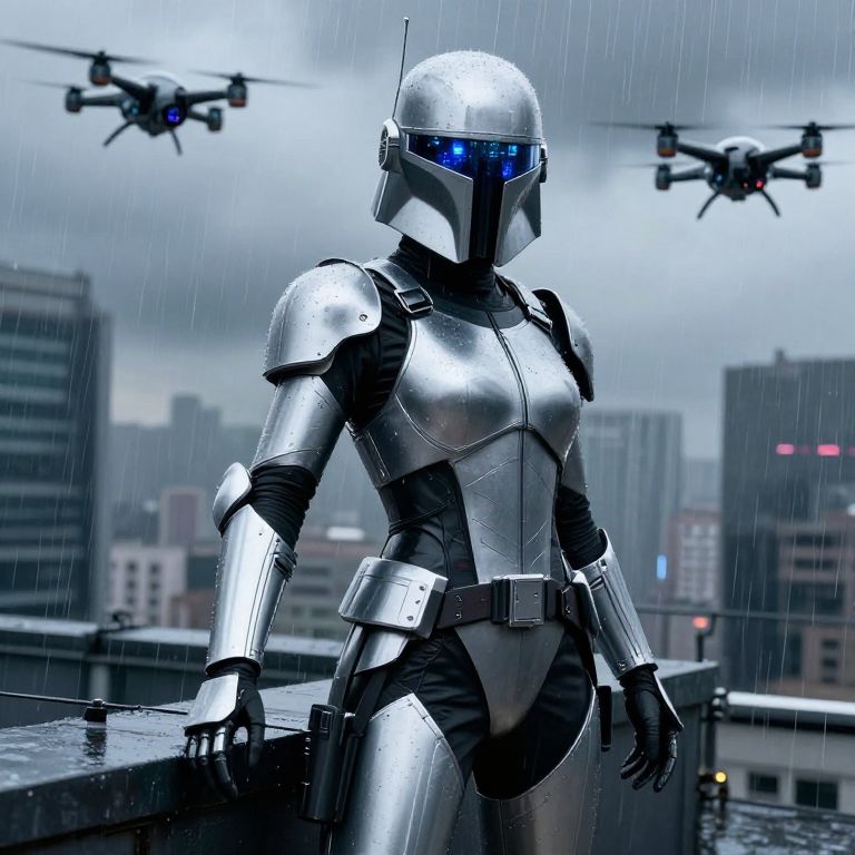 Digital artwork of a silver, armored female robot with blue visor, standing on a rainy rooftop, with two drones in the cloudy, cityscape background