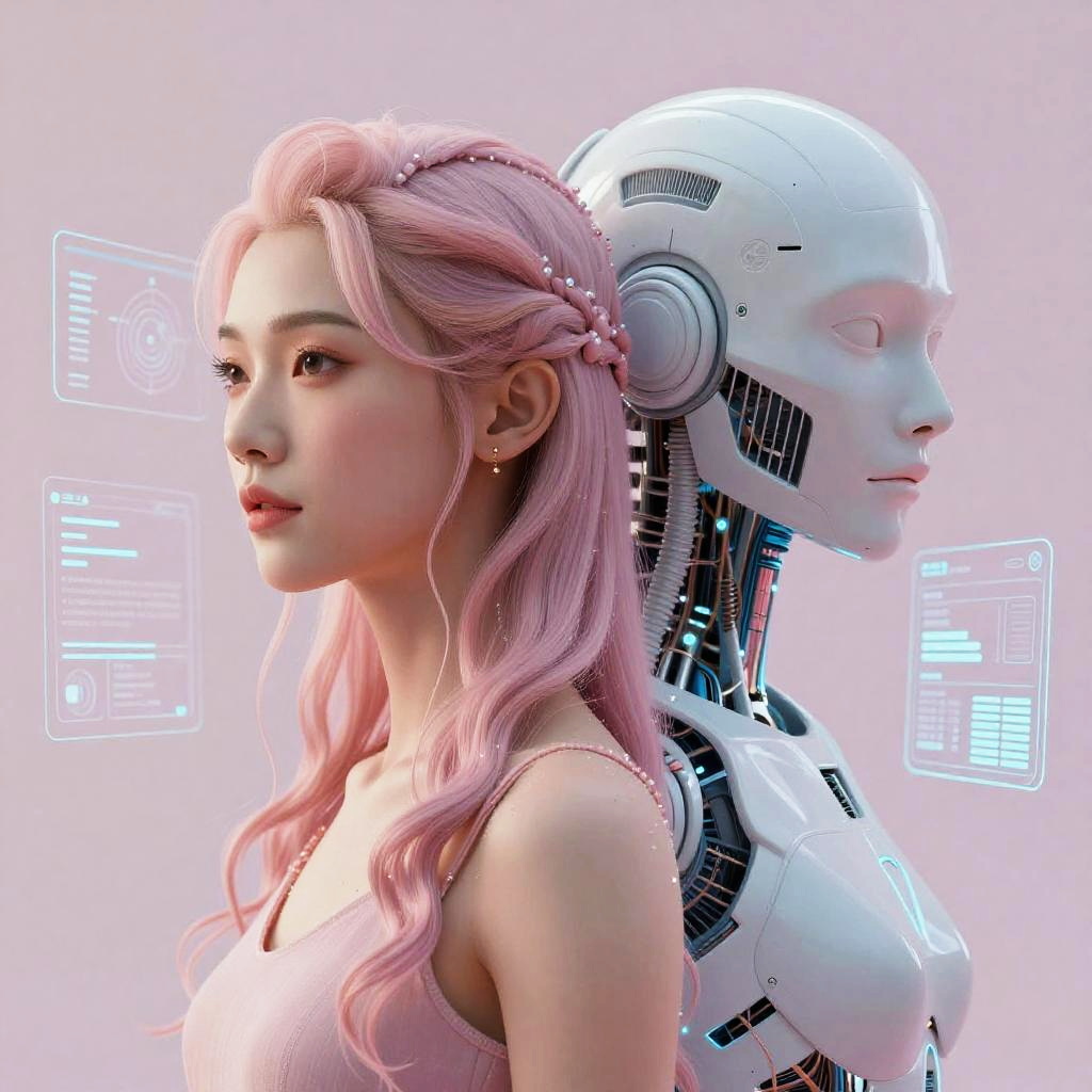Transgender AI generator illustrating a surreal fusion of human and machine, with delicate feminine and masculine traits balanced seamlessly, surrounded by holographic interfaces and soft pastel hues, conveying empowerment and technology integration.