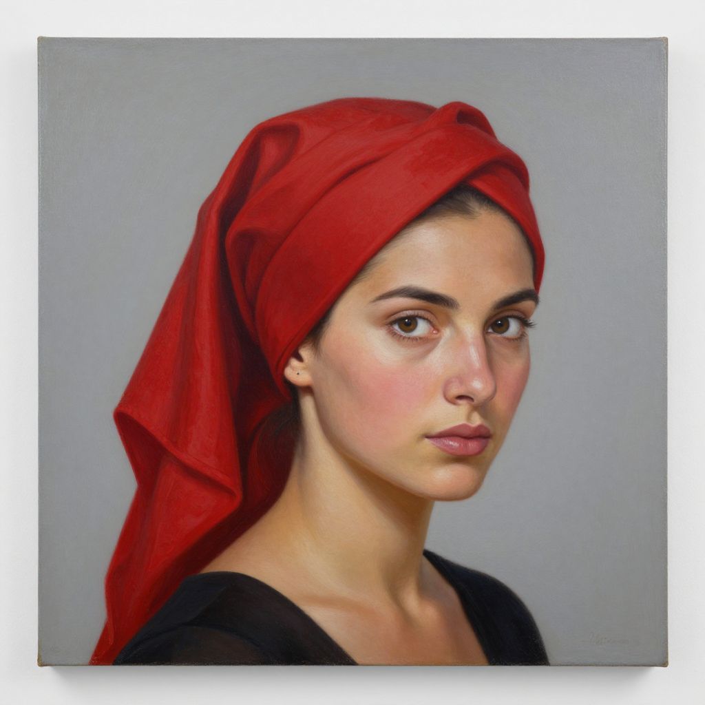 Realistic digital portrait of a young woman with fair skin, dark brown eyes, and a red headscarf, wearing a black top, against a