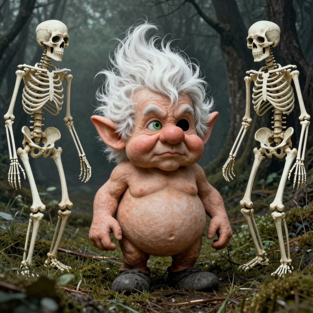 Photorealistic CGI image of a chubby, nude, old-man-like goblin with large green eyes, white wild hair, and pointed ears, standing in a foggy forest. He has a slightly protruding belly and small, dark feet. Flanking him are two detailed, humanoid skeleton figures with white bones and hollow eye sockets, standing on either side. The ground is covered in moss and small plants. The goblin's expression is curious, with a slight smile. The background is dark and misty, with tall, shadowy trees. The image combines fantasy and realism, highlighting the goblin's cartoonish features against the eerie, natural setting.