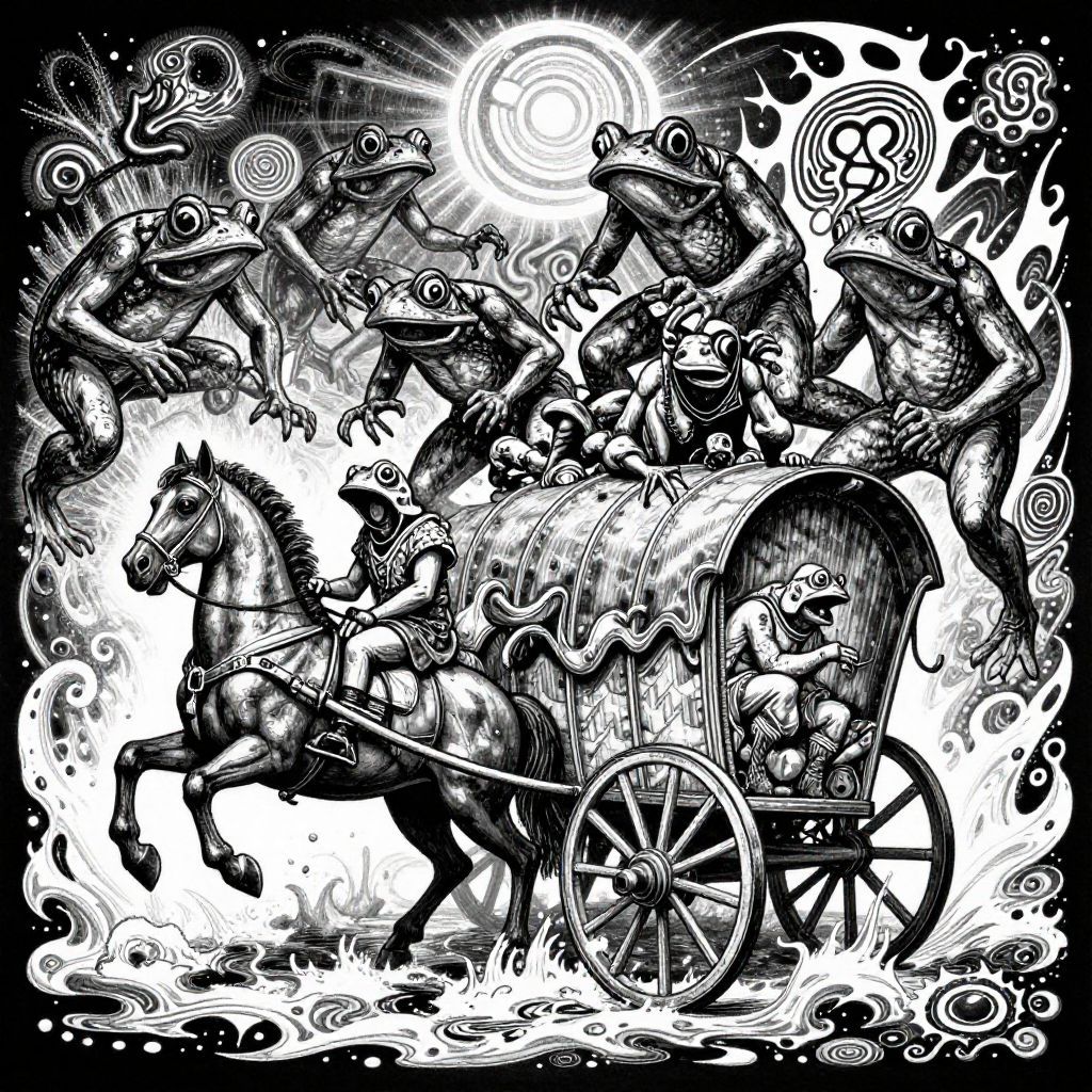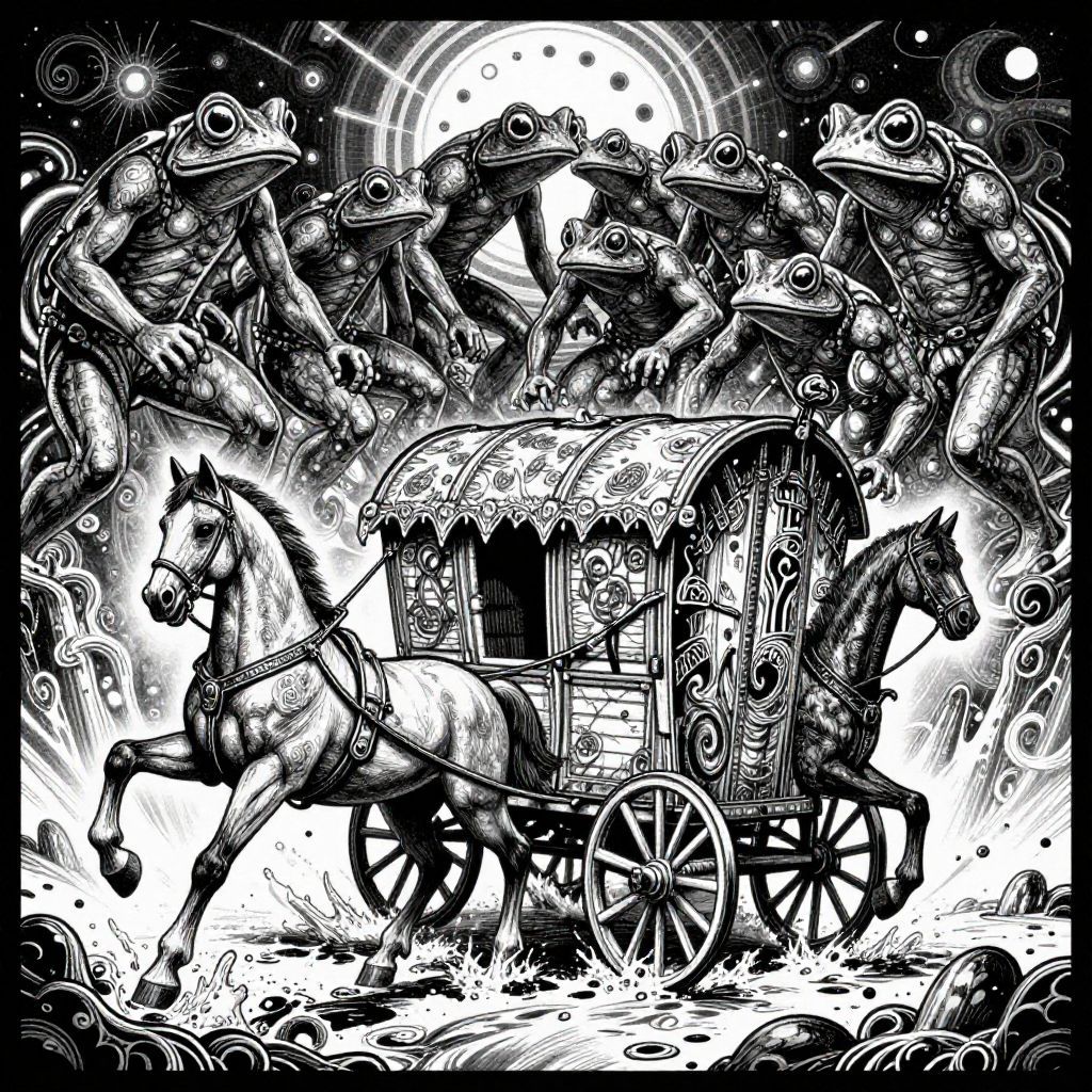 Ink Dilution black and white psychedelic spiritual horror pop art of a medieval horse drawn wagon attacked by massive frog-men,