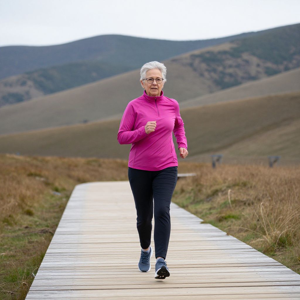 Photograph of an elderly woman with short gray hair, wearing a pink hoodie and black pants, running on a wooden path through a grassy, mountain