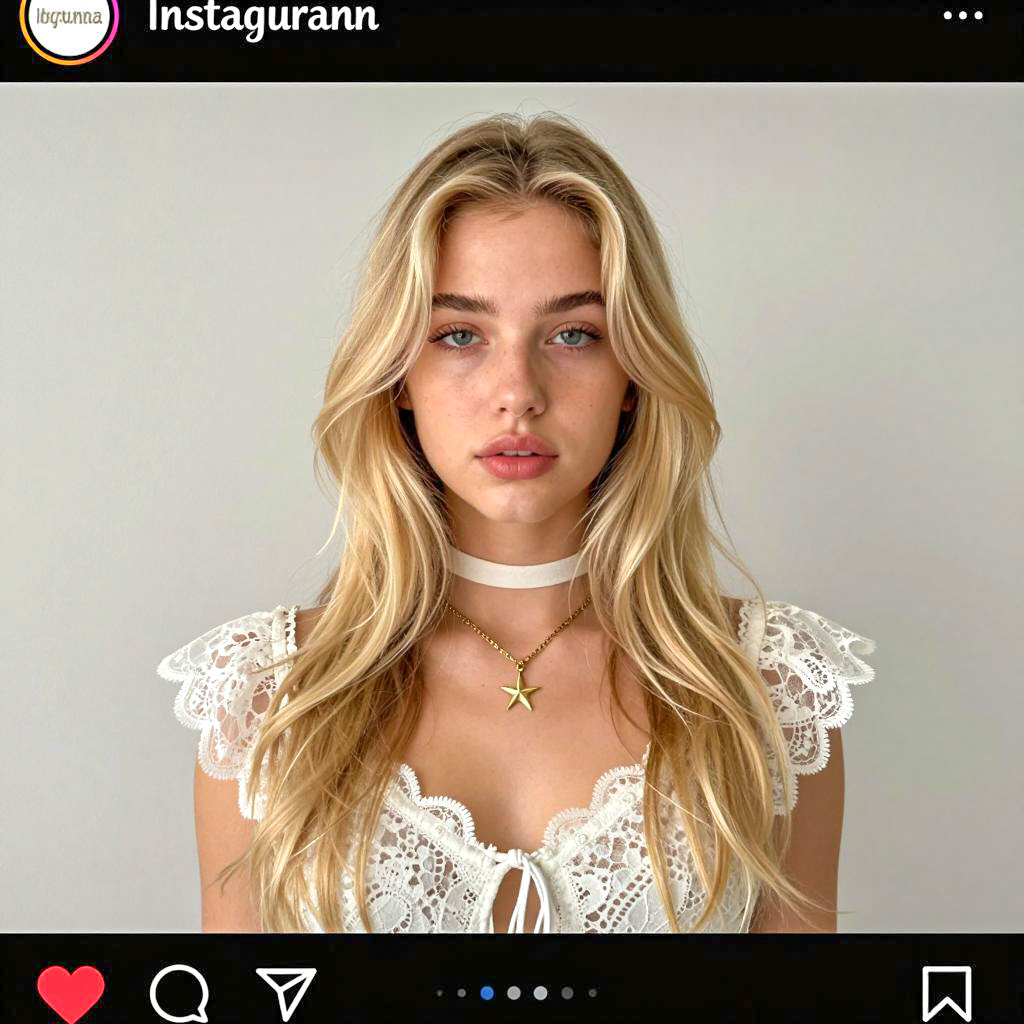 Photograph of a young woman with long, wavy, blonde hair, light skin, and full lips. She wears a white lace top with puffy sleeves, a delicate gold necklace with a star pendant, and a choker. Her expression is neutral, looking directly at the camera. The background is a plain, light gray wall. Instagram post interface at the top and bottom of the image.