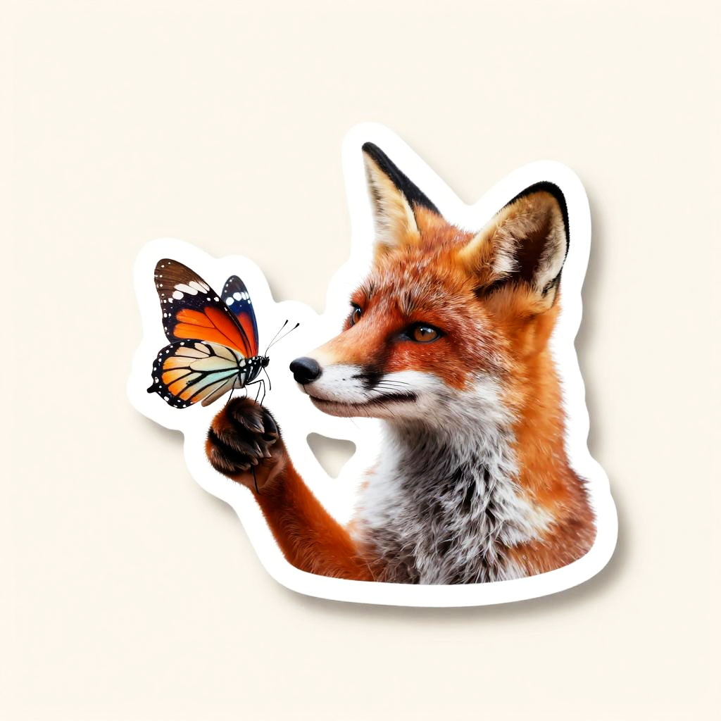 Cut sticker depicting the fox holding the butterfly, a solid cream background