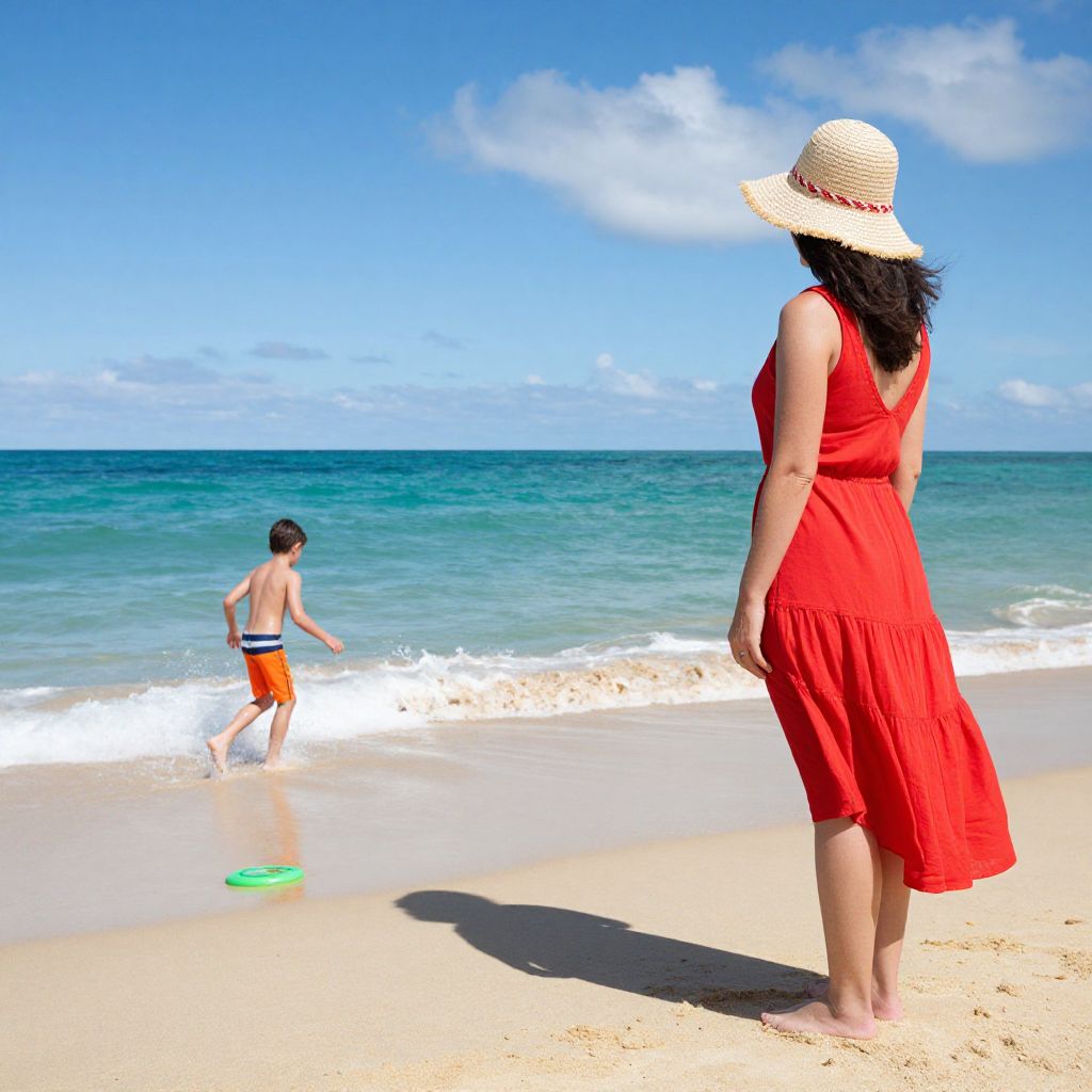 Woman in a vibrant red dress and straw hat stands on the sandy beach, her shadow cast by the sun as she watches a young boy in orange swim trunks playfully running into the turquoise waves, with a green frisbee lying near the shoreline under a bright blue sky dotted with fluffy clouds.