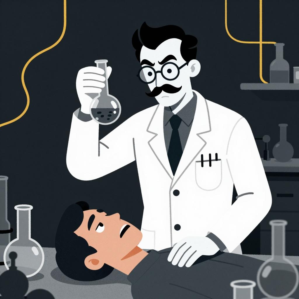 Illustration of a middle-aged man with glasses, mustache, and light blue shirt, leaning forward at a desk. He has a slightly concerned expression. He holds a stack of white papers with a red stapler on top. Bright yellow background.