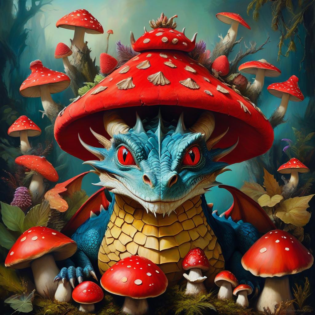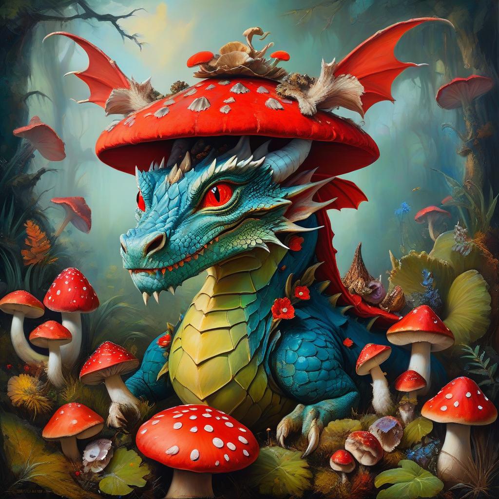 Fine art painting of a dragon with a red mushroom hat, surrounded by mushrooms, Frida Kahlo style, fantasy art, detailed portrait, vibrant colors, whimsical atmosphere, high-res, oil painting, fine art, colorful, detailed portrait, high-res, oil painting