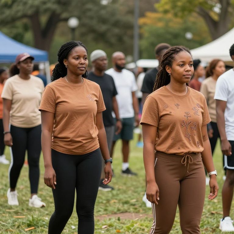 Fashion-forward joggers in earthy tones with subtle floral embroidery, worn by a diverse group in a park during a community wellness festival, blending comfort and style in natural outdoor environment.