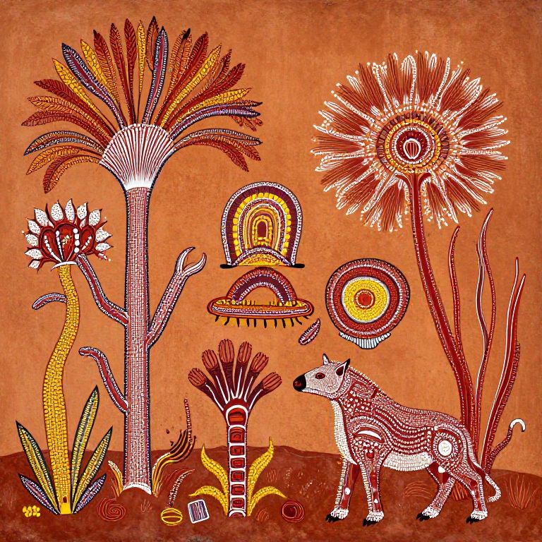 Traditional Aboriginal art scene inspired by Broome region, intricate dot paintings depicting local flora and fauna, earthy color palette with ochres, reds, and yellows, cultural motifs blending naturally with a textured canvas background