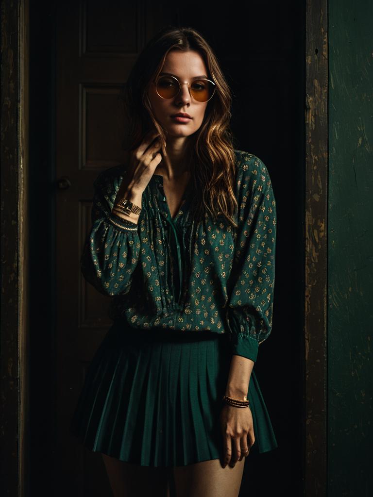 A young woman with long wavy hair wearing a dark green patterned blouse with long sleeves and elastic cuffs, paired with a pleated mini skirt in matching green tones. She accessorizes with oversized round sunglasses with amber tint, a chunky gold watch, and multiple thin bracelets. The setting includes a rustic interior with a worn wooden door in the background, contributing to the bohemian aesthetic.