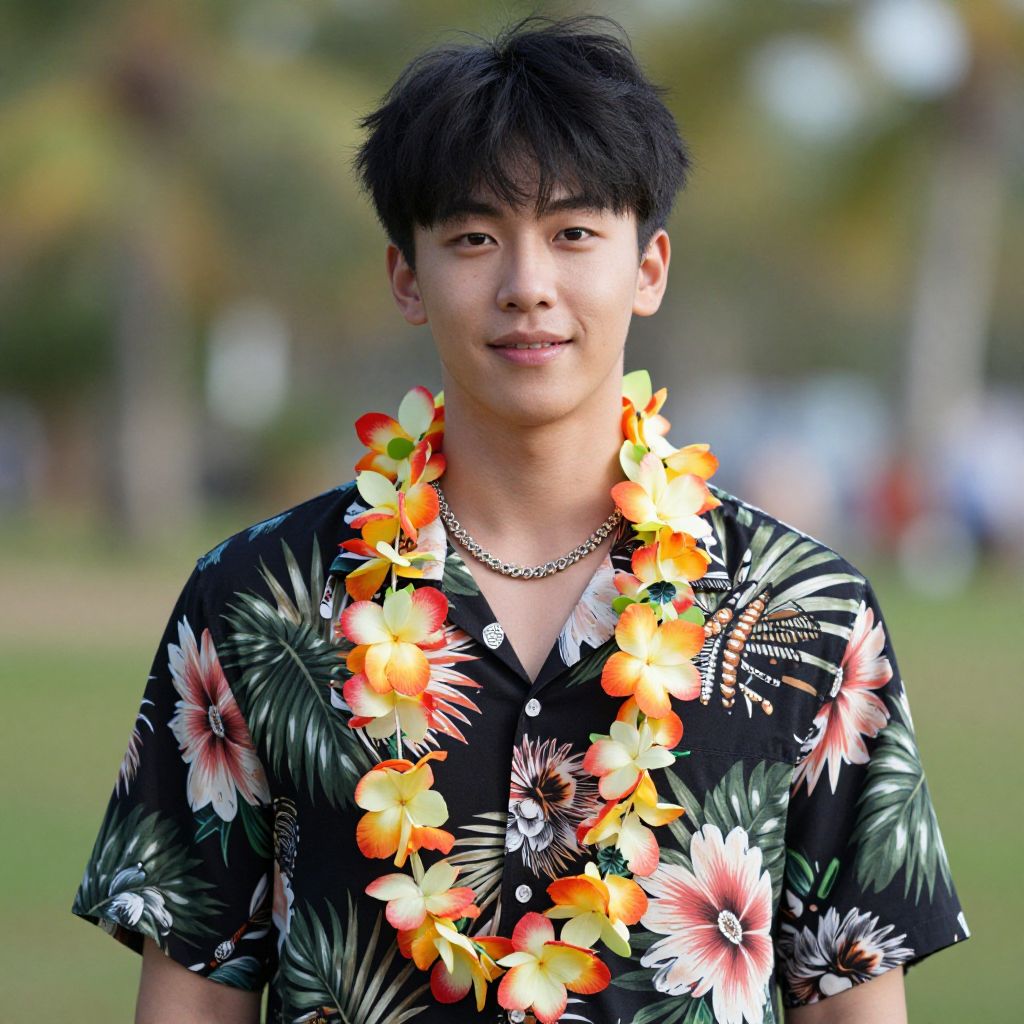 Photograph of an Asian man with short black hair, wearing a colorful blue Hawaiian shirt featuring white and green tropical leaves, adorned with a vibrant lei of large, multicolored flowers (yellow, red, white, orange) around his neck and a matching floral headband. He has a neutral expression and is standing against a plain, light green background with his hands in his pockets. He wears a simple silver bracelet on his right wrist and a matching necklace. The image has a slightly digital, enhanced color effect.