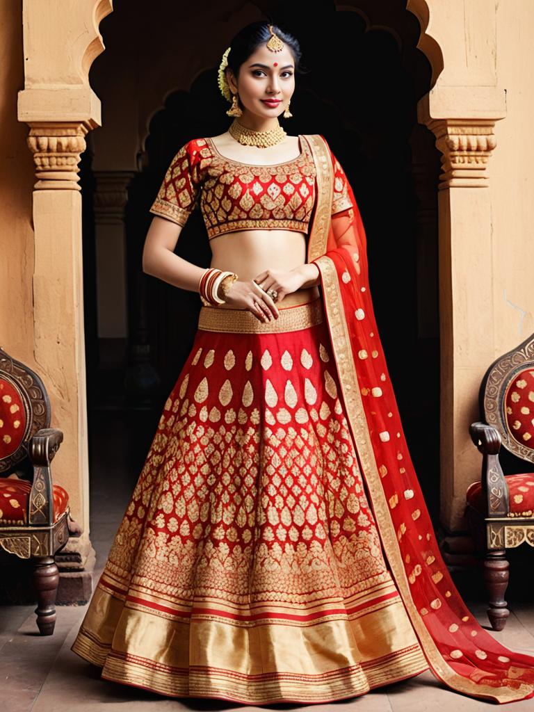 Silk Wedding Lehenga Choli, a woman in a red and gold lehen with a red and gold lehen --sref 1393