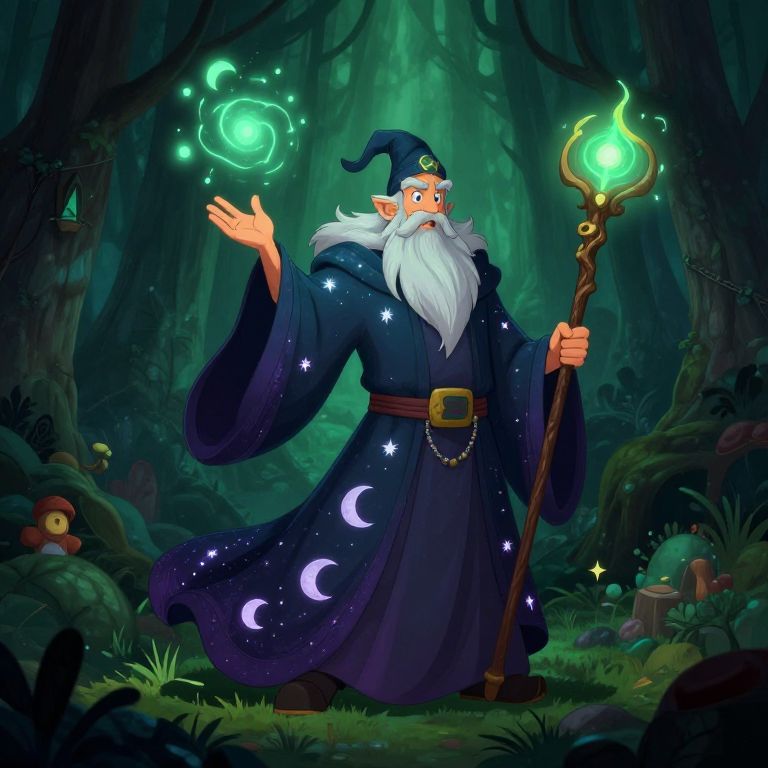 Cartoon character male wizard casting a spell in a mystical forest, flowing robes with stars and moons, long beard, magical glowing staff, enchanted glowing particles floating around, rich green and purple color palette, detailed fantasy background