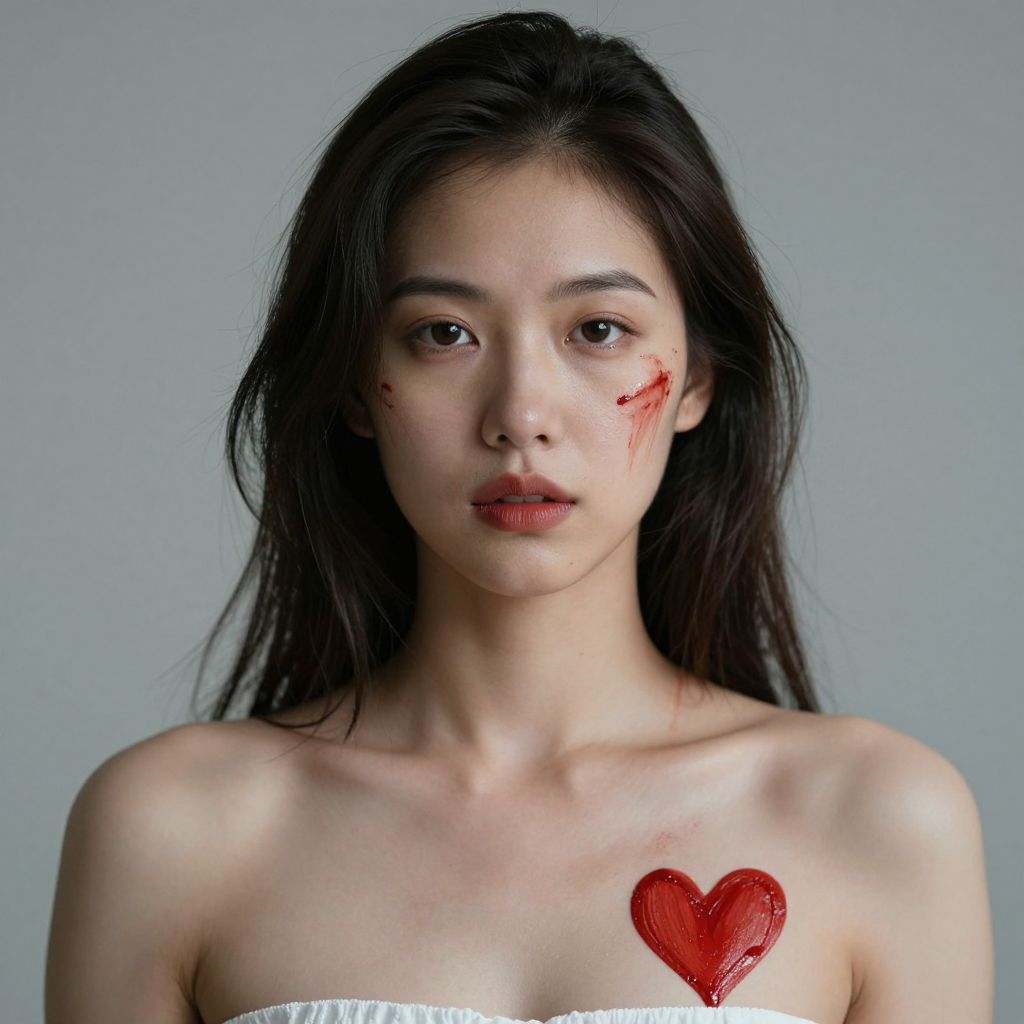 A woman with bloodstains on her face and a red heart on her chest.