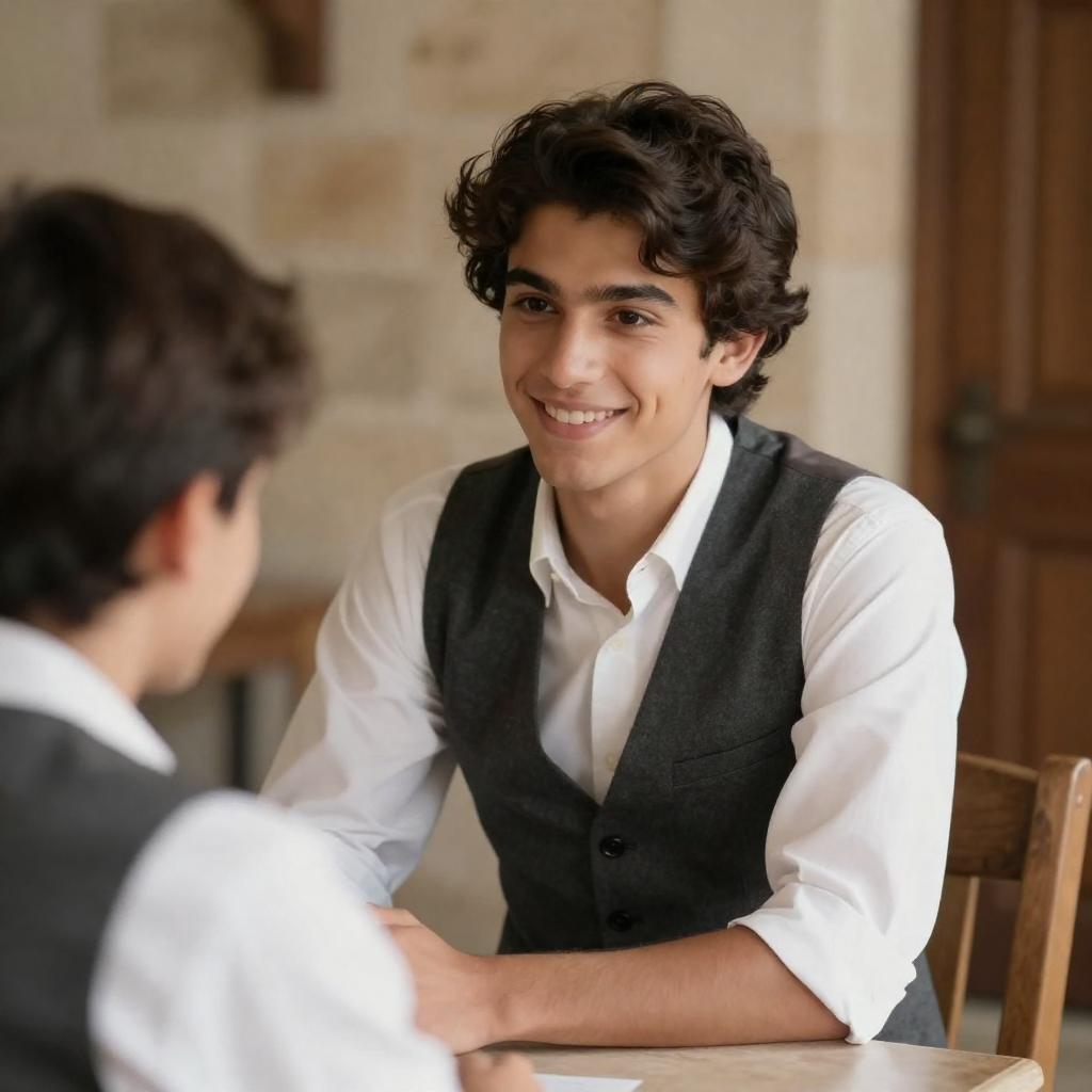 Photograph of a young man with dark, wavy hair, wearing a white shirt and dark gray vest, smiling while seated at a table. He faces another person with short dark hair, seen from behind, in a rustic stone-walled setting. The young man's right hand rests on the table, and the background includes a ured stone wall and wooden door.