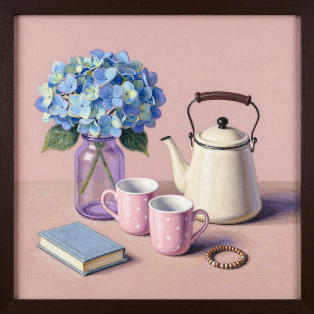 This is a pastel chalk of a decorative still life featuring a soft lilac glass jar with blue hydrangeas on the left, a pair of pink polka-dotted mugs in the center, and a matte cream enamel tea kettle on the right. A small book and a coiled bracelet sit in front, with gentle highlights and soft shadows to suggest depth. The background is a faded blush pink canvas backdrop, and the whole scene is framed with a dark brown border. Emphasize cozy tones, crisp edges, subtle surface texture, and calm, balanced composition.