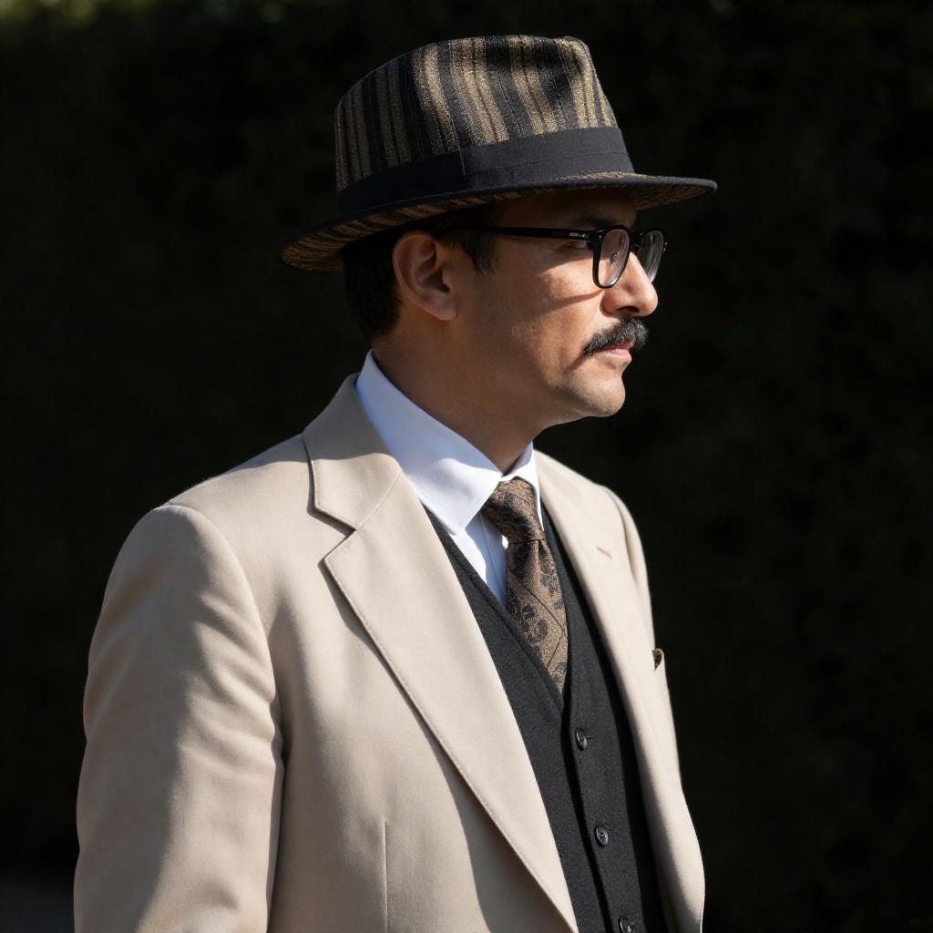 Man in light beige suit, white shirt, dark tie, and straw hat with black band, standing by stone birdbath. Wearing glasses, mustache, dark hair. Holding glass in right hand. Green garden with flowers in background. Birdbath has metal finial. Man looks to the right, slightly smiling. Daylight.