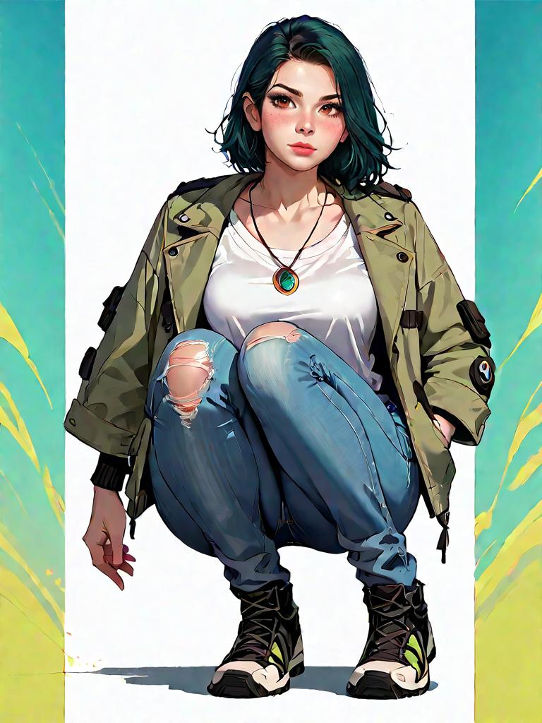 Illustration of a young woman with long black hair, wearing a white sleeveless knit top with a plunging V-neckline, paired with high-waisted olive green tapered trousers cropped at the ankle. She accessorizes with black ankle boots with slight heels, minimal jewelry including bracelets and a neck chain. The style is casual chic with a confident standing pose against a plain white background accented by a horizontal teal rectangle.