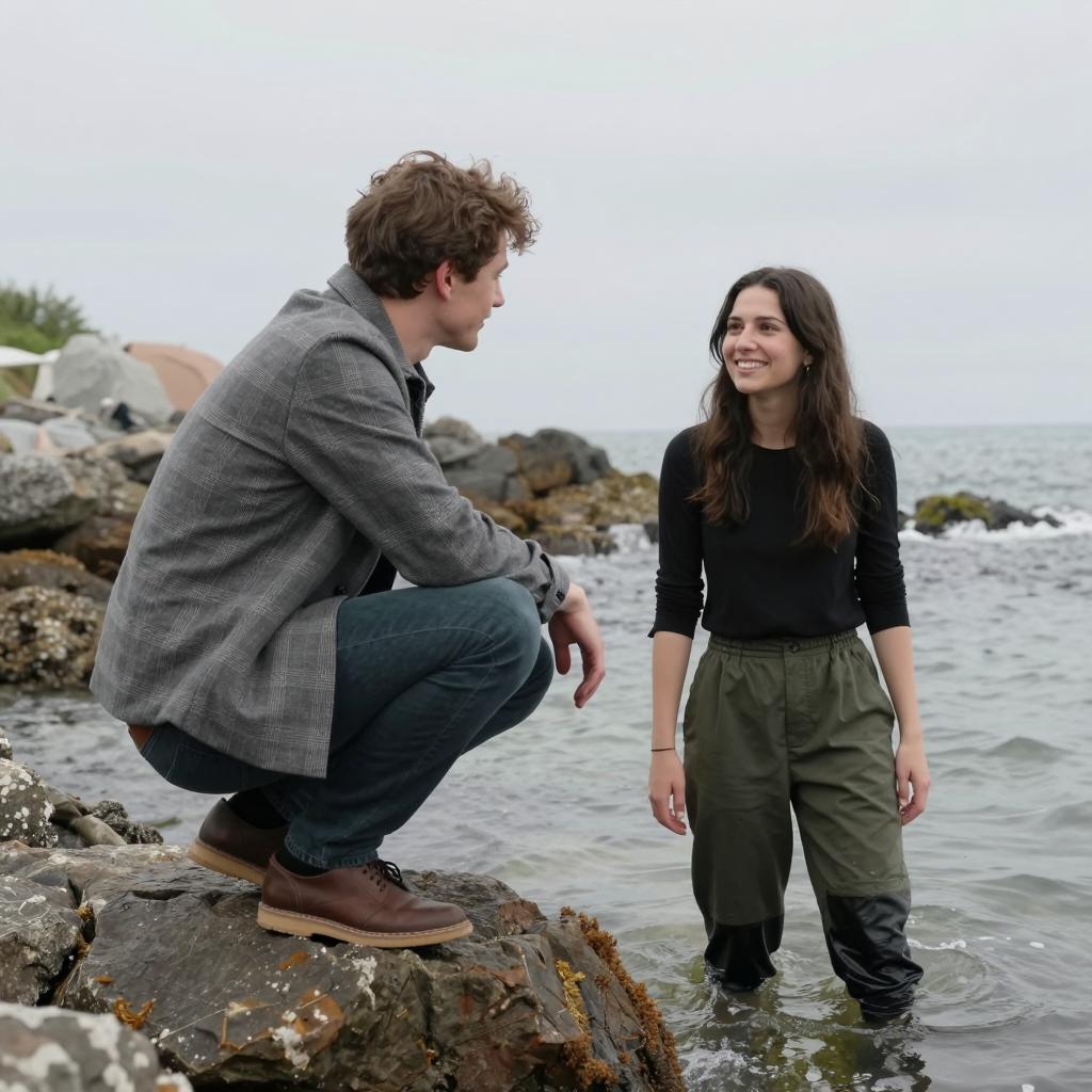 Two people under a wooden wagon in a grassy field. Woman with dark hair in a gray shirt, smiling, sits on the right. Man with brown hair, lying on his back, head resting on his hand, wears dark clothes. Wagon's wooden legs and wheels are above them. Dry grass covers the ground. Woman's right hand rests on her lap.