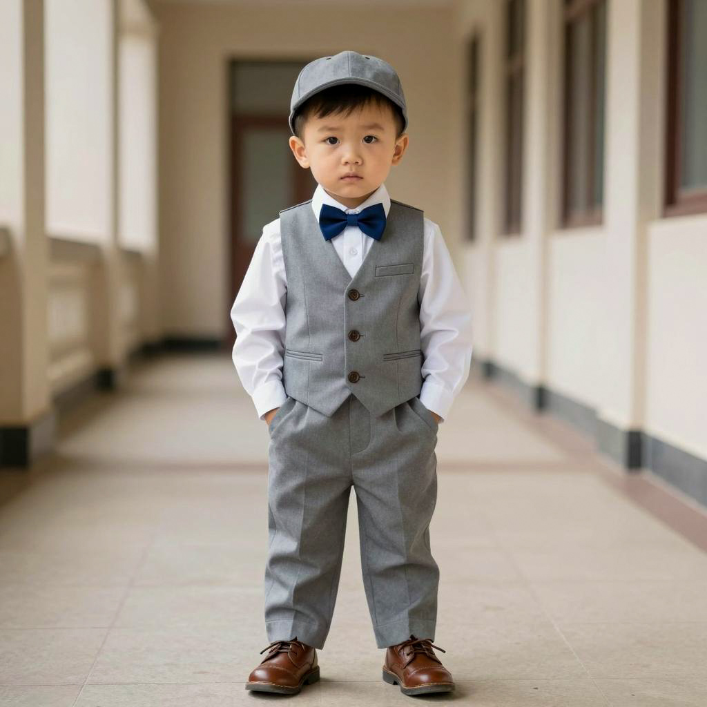 Infant schoolboy costume, photograph of a young boy, standing in a hallway, full body, centered, formal outfit, grey vest, white long-sleeve shirt, grey pants, brown leather shoes, blue bow tie, grey cap, neutral background, soft lighting, classic architecture, slightly blurred hallway, child's serious expression, hands in pockets, bright daylight, realistic style