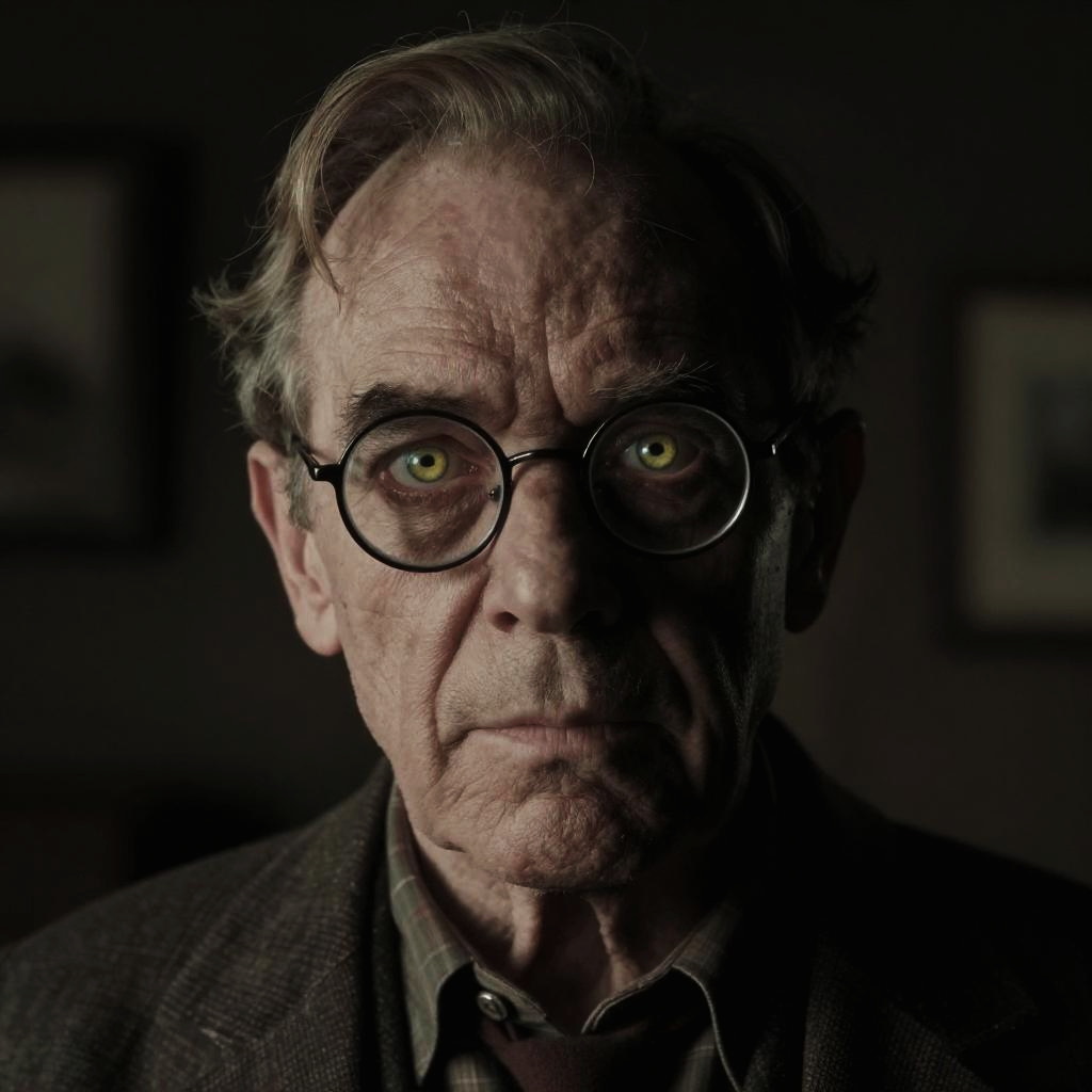 Close-up portrait of Uncle Fester with glasses, mysterious glowing eyes, dimly lit room, vintage horror vibe, high detail, dark textured background
