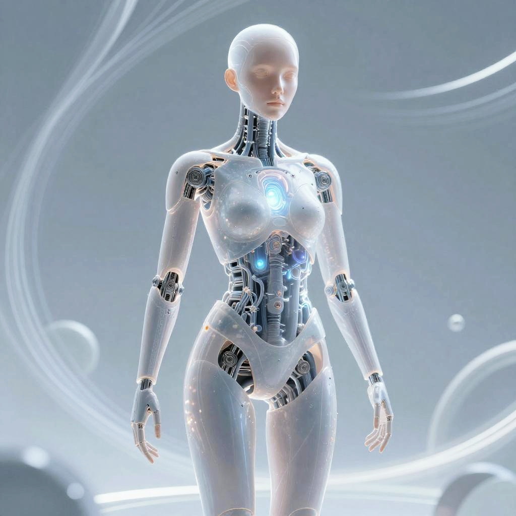 Photorealistic CGI image of a futuristic, humanoid robot woman with a sleek, shiny white metallic body and black circuitry patterns. She stands confidently with a neutral expression, her head bald and featureless. Her breasts are small and her physique is slender and athletic. The background is a gradient of light gray to white with swirling, glowing white light patterns. Her arms and legs have visible joints and mechanical details. The overall style is high-tech and futuristic, emphasizing advanced robotics and artificial intelligence.