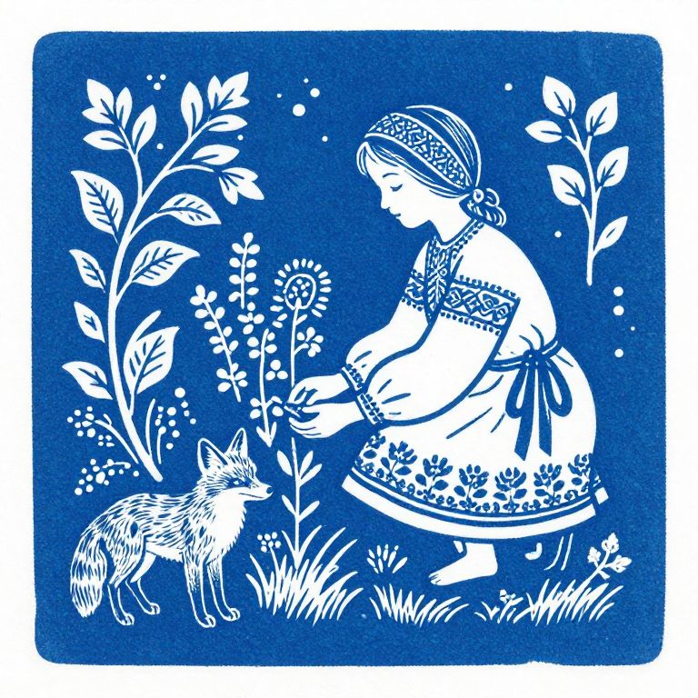 Washes royal blue linoprint, white lines, ornamental, girl in traditional baltic clothes picking flowers, fox in the back,