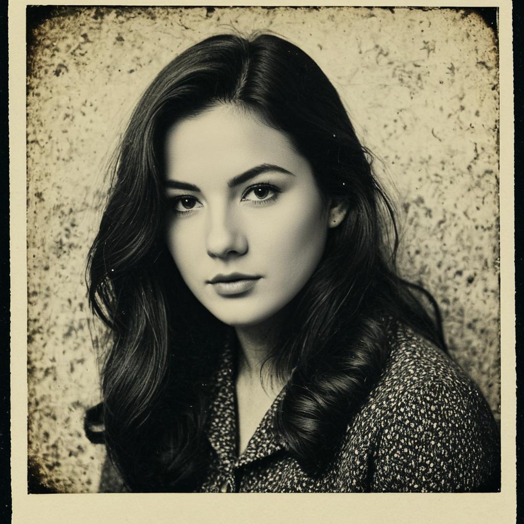 This is a black-and-white photograph of a young woman with long, wavy dark hair. She has a fair complexion and is wearing a textured, patterned coat. Her expression is neutral, with slightly parted lips and a direct gaze at the camera. The background is a rough, textured surface, possibly concrete, which contrasts with her smooth skin. The image has a vintage, high-contrast style, with pronounced shadows and highlights, giving it a timeless, classic feel. The photograph is bordered in white.