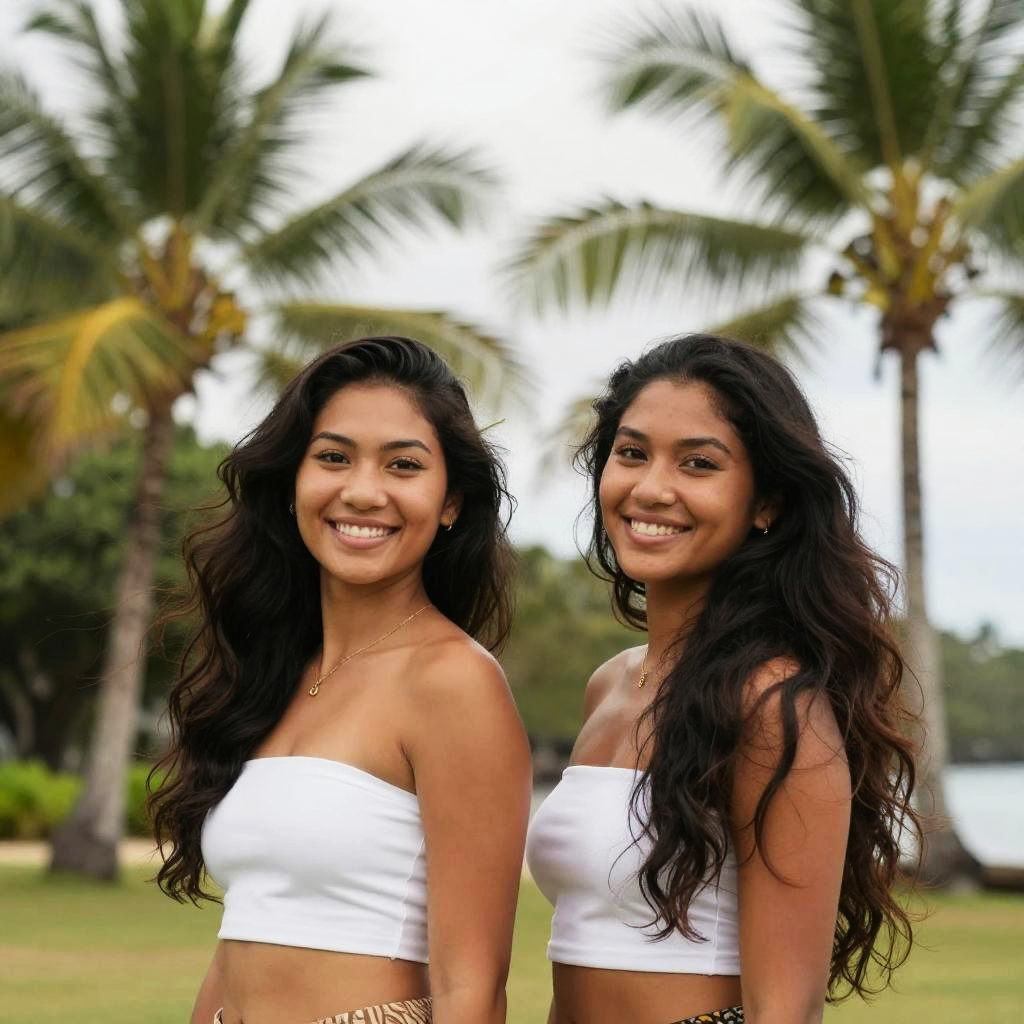 Beautiful Polynesian women with flowing long hair standing amidst tropical palm trees, radiant smiles and natural beauty, soft focus background, bright daylight, fine art photography style